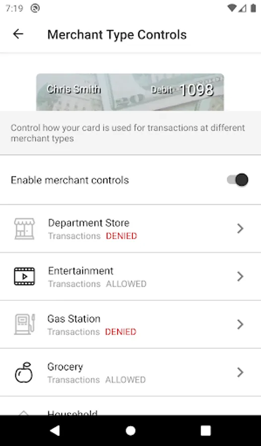 Spending limits can be established to allow transactions up to a certain dollar value and decline transactions when amounts exceed your defined thresholds. Transactions can be monitored and managed for specific merchant categories such as gas stations, department stores, restaurants entertainment, travel, and groceries. Your transactions can also be monitored for specific transaction types such as in-store purchases, e-commerce transactions, mail/phone orders and ATM transactions.