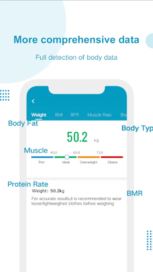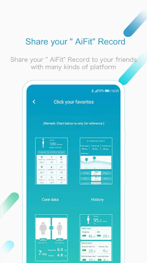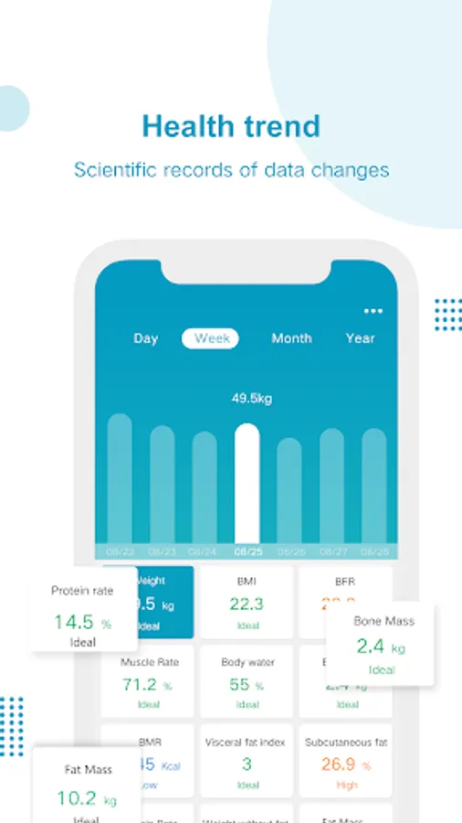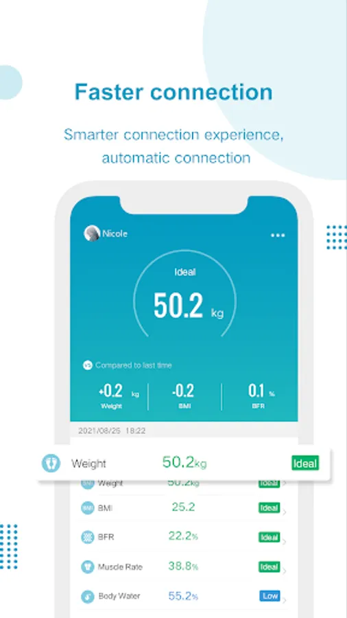 1.Connected to your mobile phone by bluetooth4.0,your weight data, health status and BMI value calculated by your weight and height will display on your app. We care your figure with daily record every minutes.