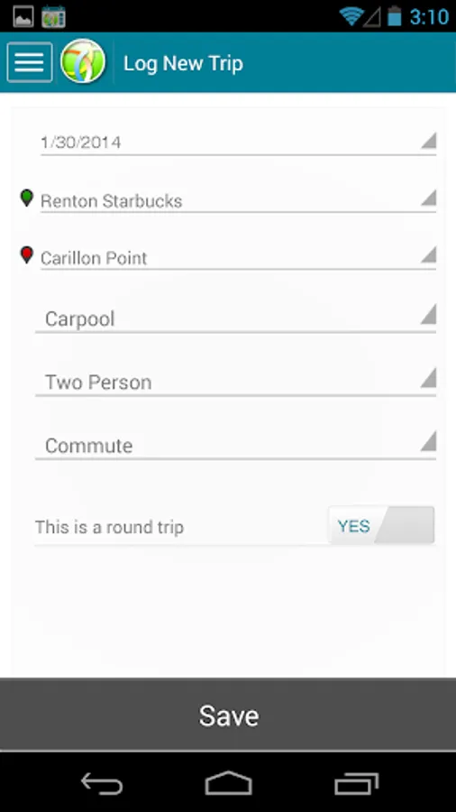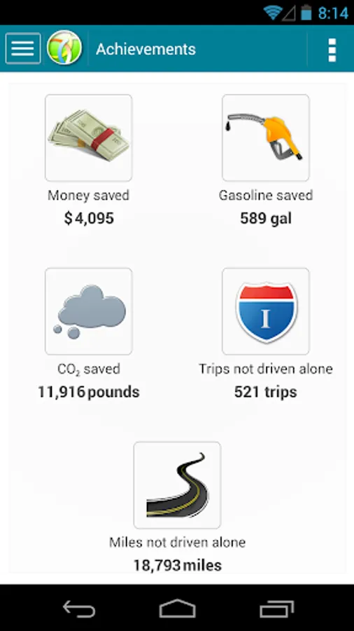 - Track your achievements that are calculated in terms of money saved ($$), gasoline saved, CO2 saved and miles not driven