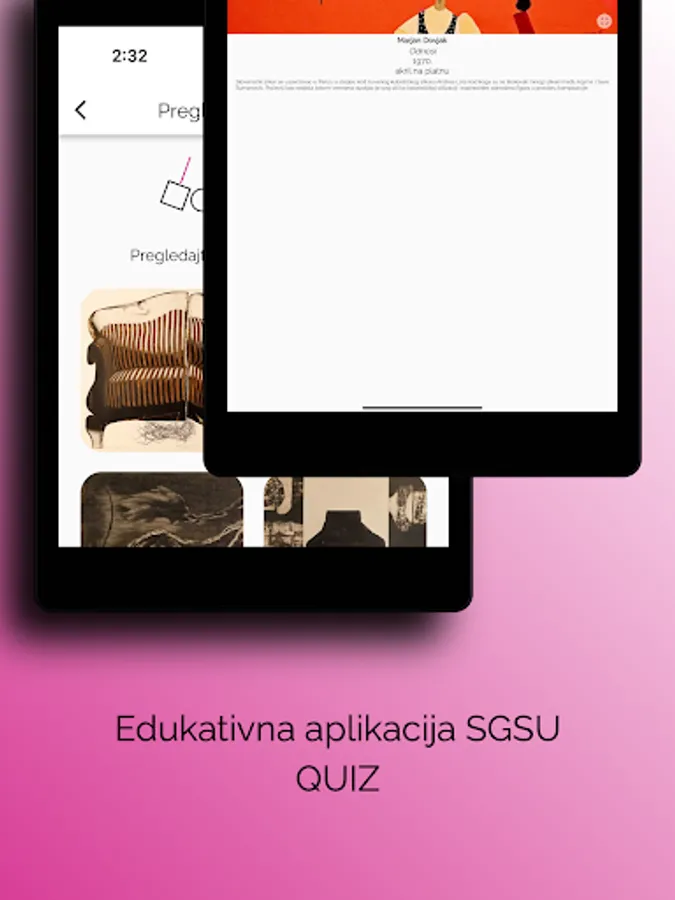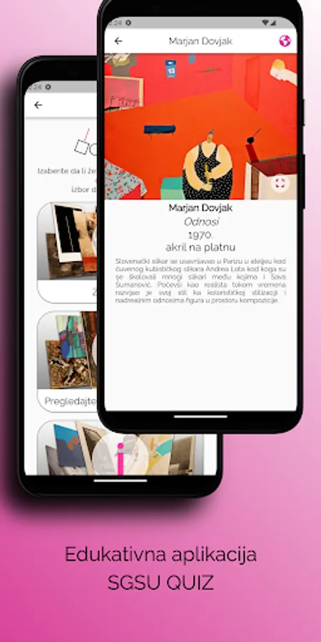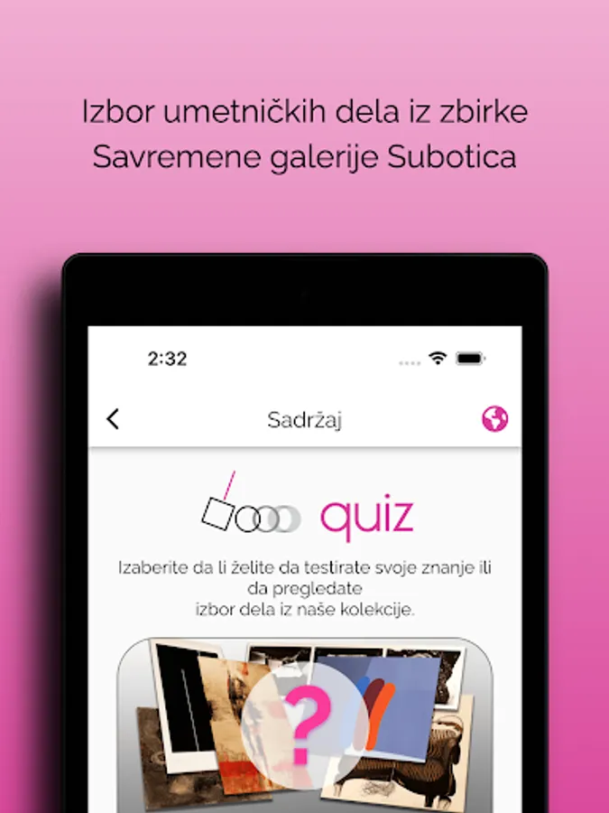 Mobilna aplikacija SGSU QUIZ je interaktivna aplikacija Savremene galerije Subotica, edukativnog karaktera. Aplikacija sadrži pregled izbora dela iz umetničke kolekcije Savremene galerije Subotica, kao i kviz pitanja kroz koja su komunicirane informacije o umetničkim delima i njihovim autorima. Galerija kolekcioniše umetnost od 1962. godine i čuva oko 1.500 dela, razvrstanih u četiri zbirke. Ova aplikacija je zamišljena kao početak upoznavanja sa tim vrednim umetničkim nasleđem i onima koji su ga stvarali.