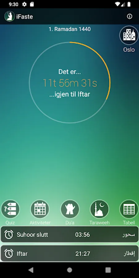 iFaste is your ultimate Ramadan app in Norwegian. It shows prayer times from over 136 cities in Norway, reading of du'a (Qari Ziyaad Patel, South Africa) and IslamQuiz.