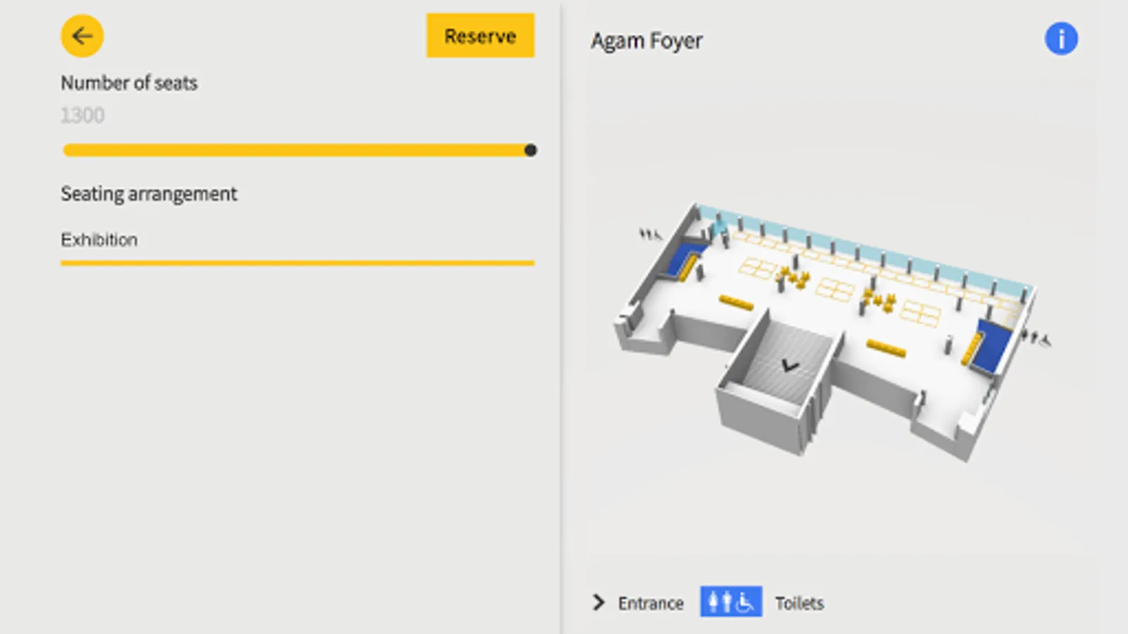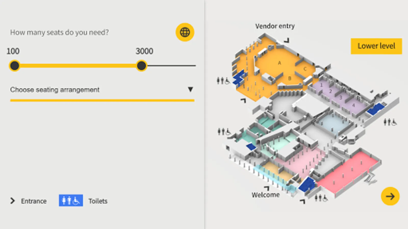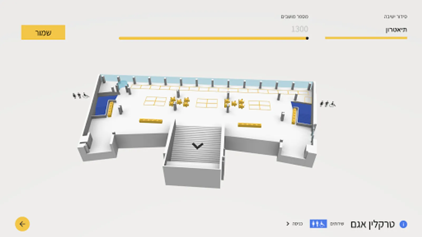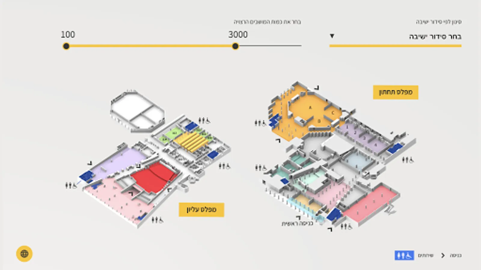 המפה מציגה את האולמות השונים של מרכז הקונגרסים בצורה תלת מימדית ומאפשרת לבצע תכנון ראשוני של אירועים בצורה נוחה ופשוטה.
