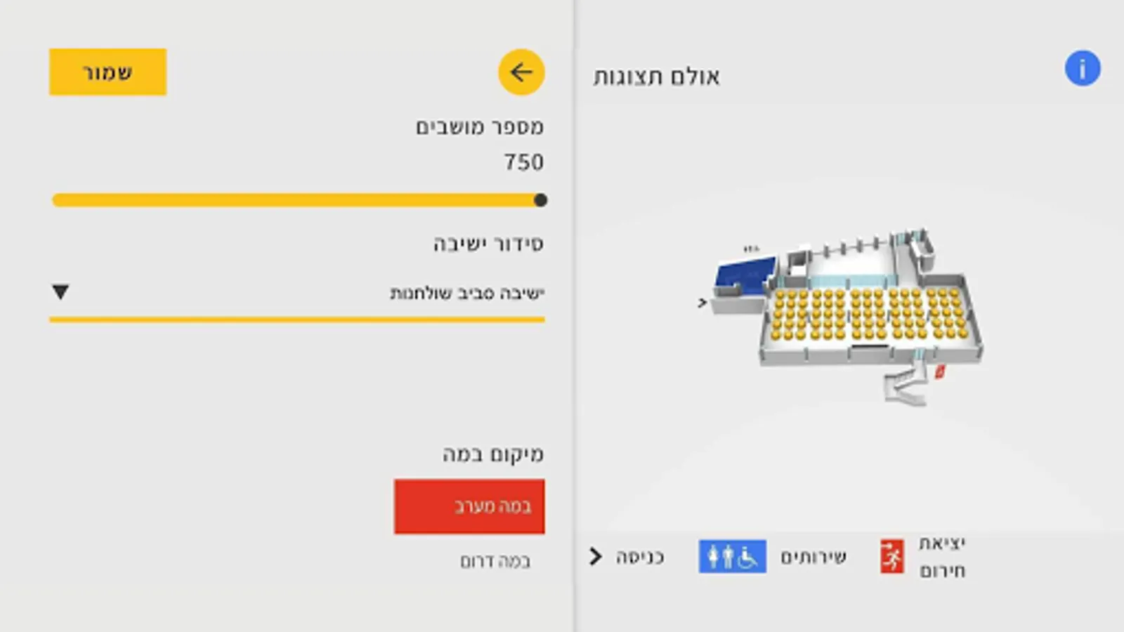 באפליקציה ניתן לבחור את האולם המתאים, כמות האורחים, סידור הישיבה, מיקום הבמה המרכזית ועוד.