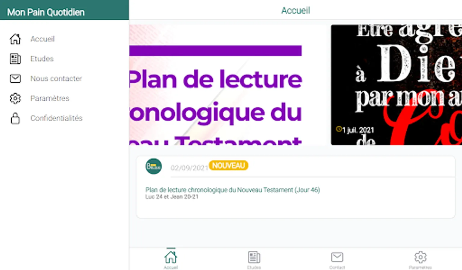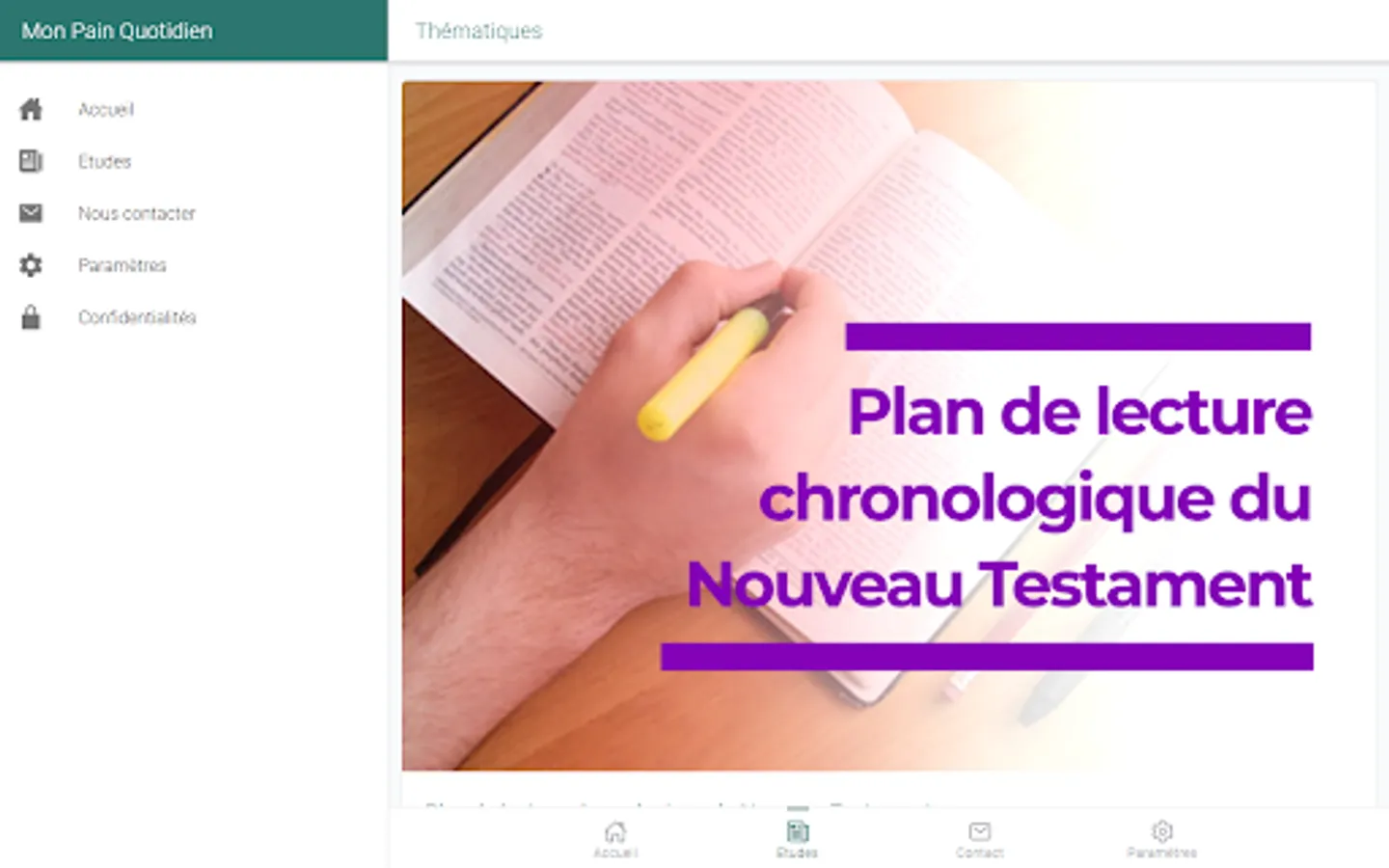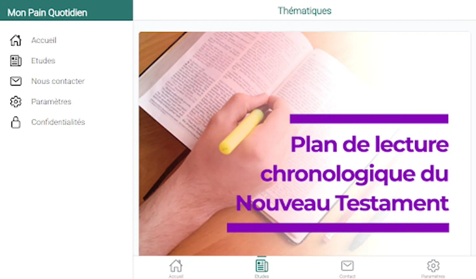Through inspired Bible studies, Mon Pain Quotidien brings you spiritual nourishment, essential for the growth and good health of your inner being.