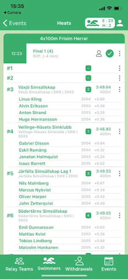 - Complete view of each heat comprises of Heat name, start time, difference in schedule along with Swimmer info on each lane with status, ranking and timing.