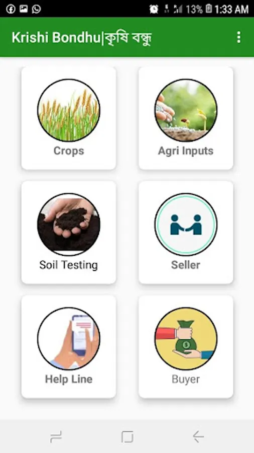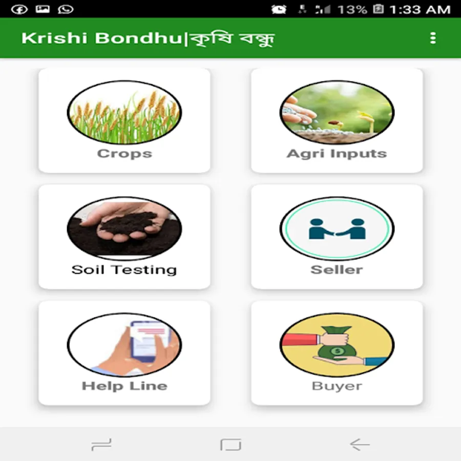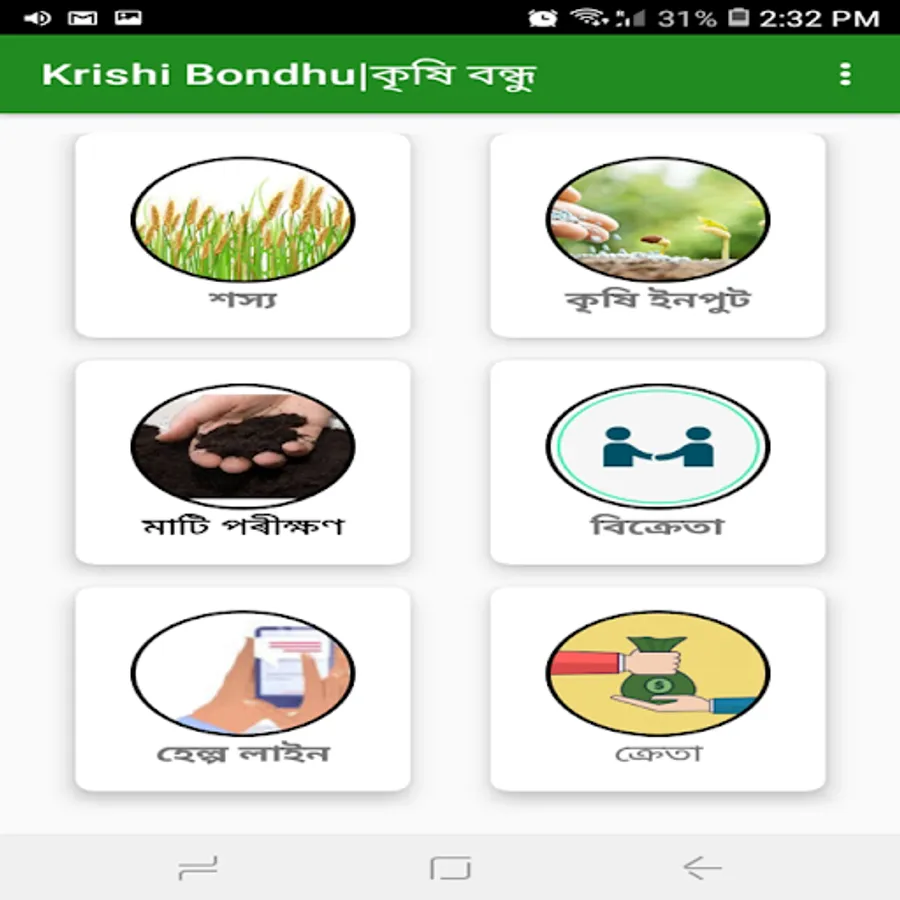 The Krishi Bondhu(কৃষি বন্ধু) app is designed to empower the farmers of the Assam and farmers can use this app in two languages- English and Assamese. Farmers can get the details of crops with their cultivating methods, request for soil testing, request for expert advice or request for any solution for any problems regarding the agriculture, farmers can sell or buy through this app, get information of agri inputs.