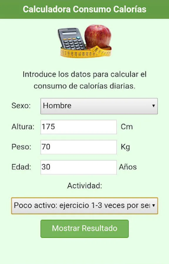 This application will help you get an initial estimate of how many calories you should eat each day.