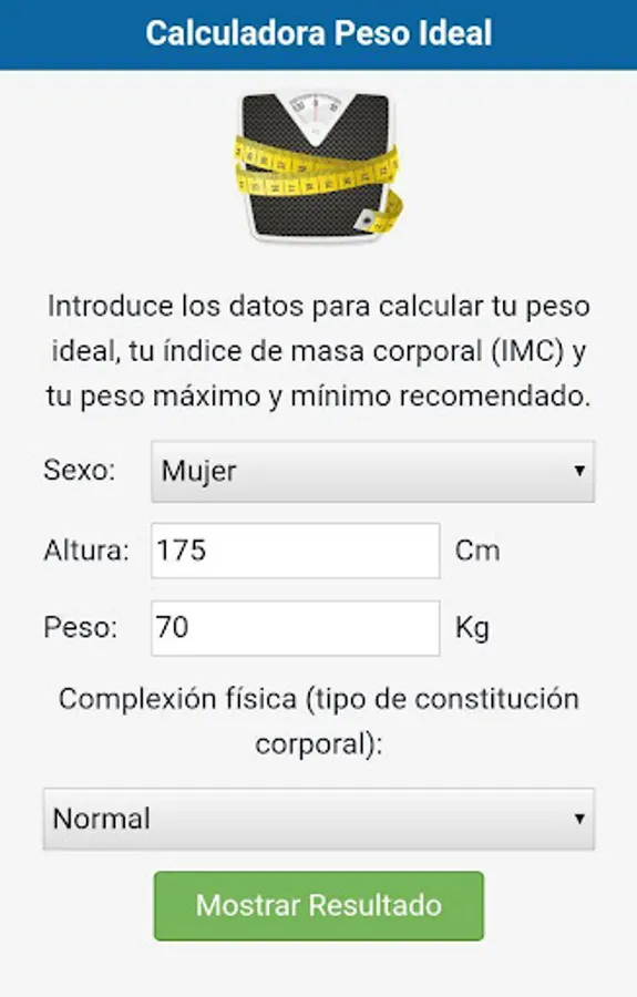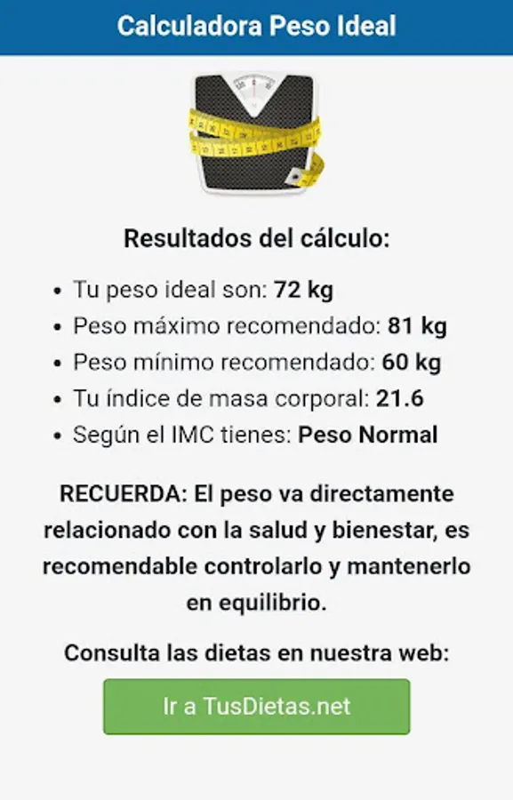 This application will show you what is your Ideal Weight and your Body Mass Index (BMI) that will let you know if your weight range is right.