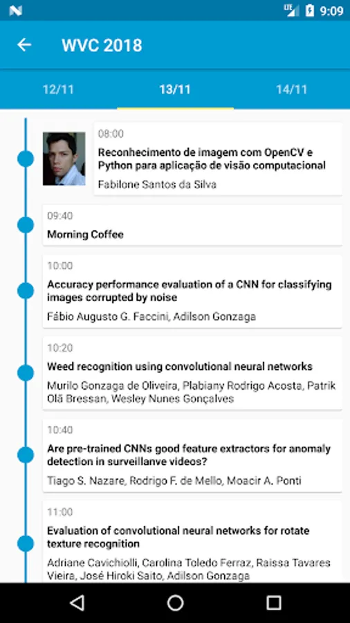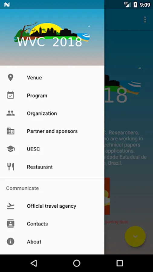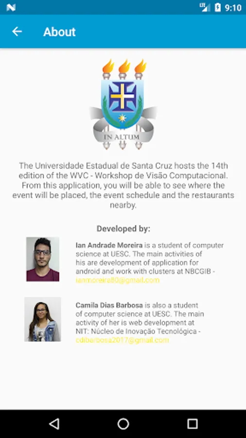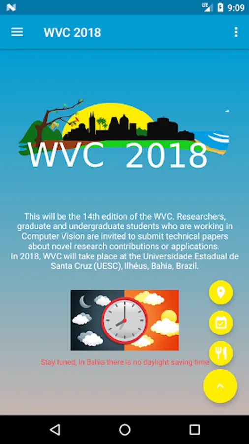 The Santa Cruz State University hosts the 14th edition of the WVC - Computer Vision Workshop. From this application, you will be able to see where the event will be placed, the event schedule and the restaurants nearby.