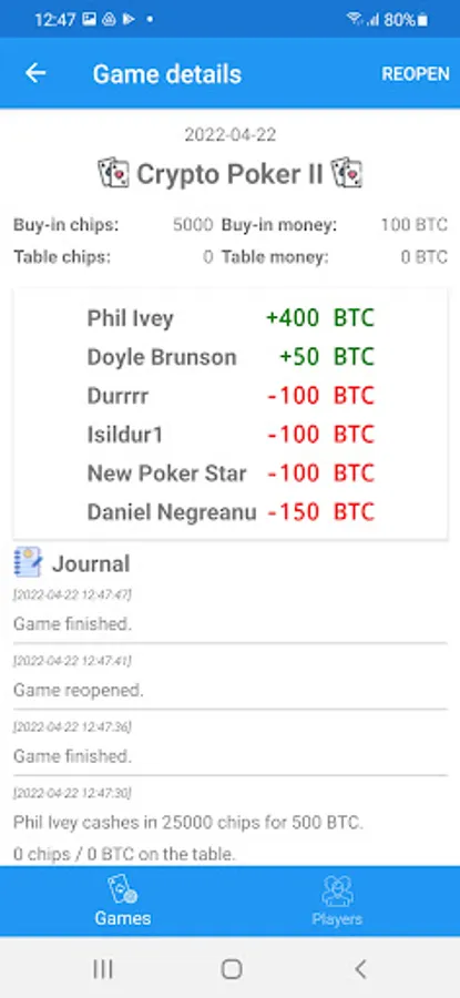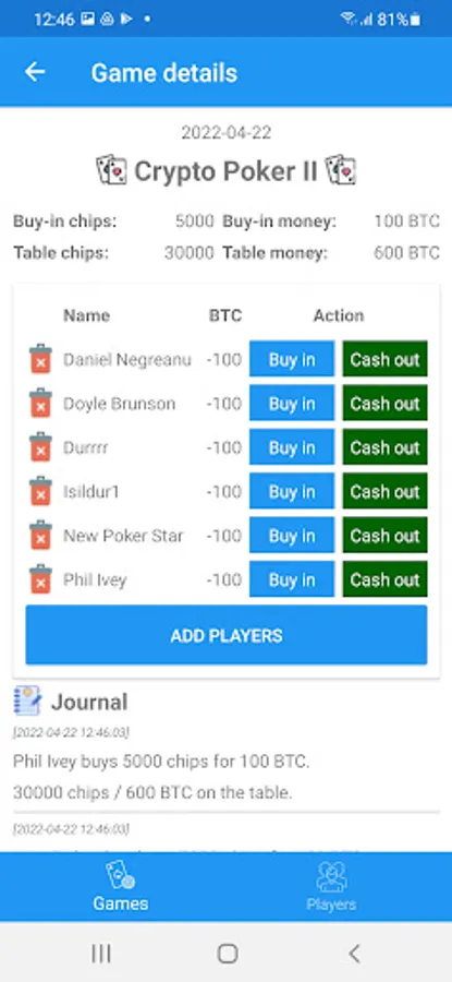 This application allows you to track buy-ins and cash-outs of your cash/ring games with friends. Create games, add players, rebuy and cash out and show final balance summary.