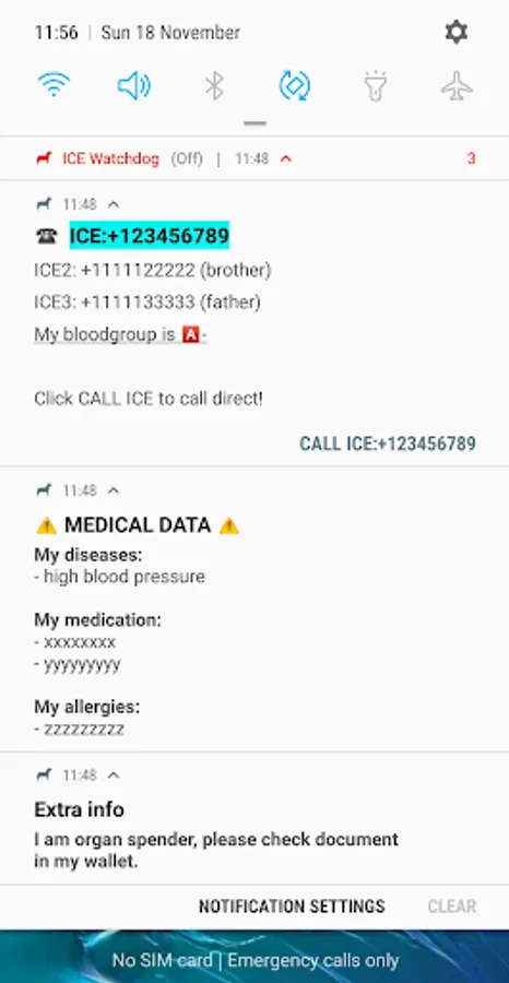 1. ICE info at the lock screen, three blocks of free text (f.ex blood group, medication, allergies, diseases, other contact numbers,...)