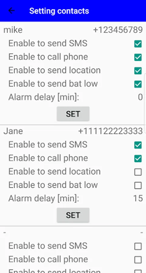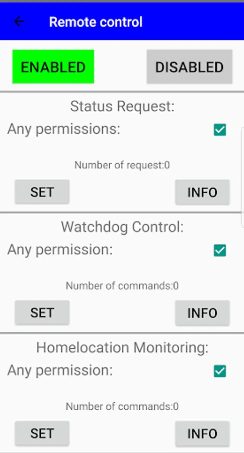 NOTE! This app needs the permissions SMS_SEND and SMS_RECEIVE (only if remote control used and full version loaded). It sends SMS only to persons defined in app by yourself!