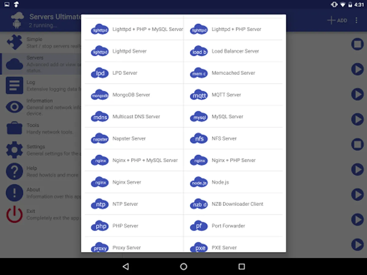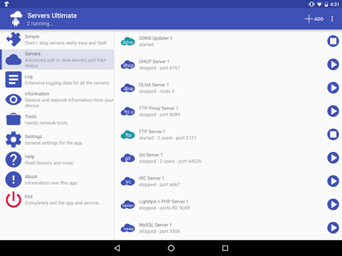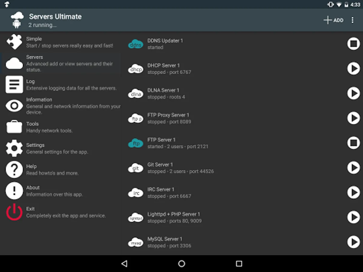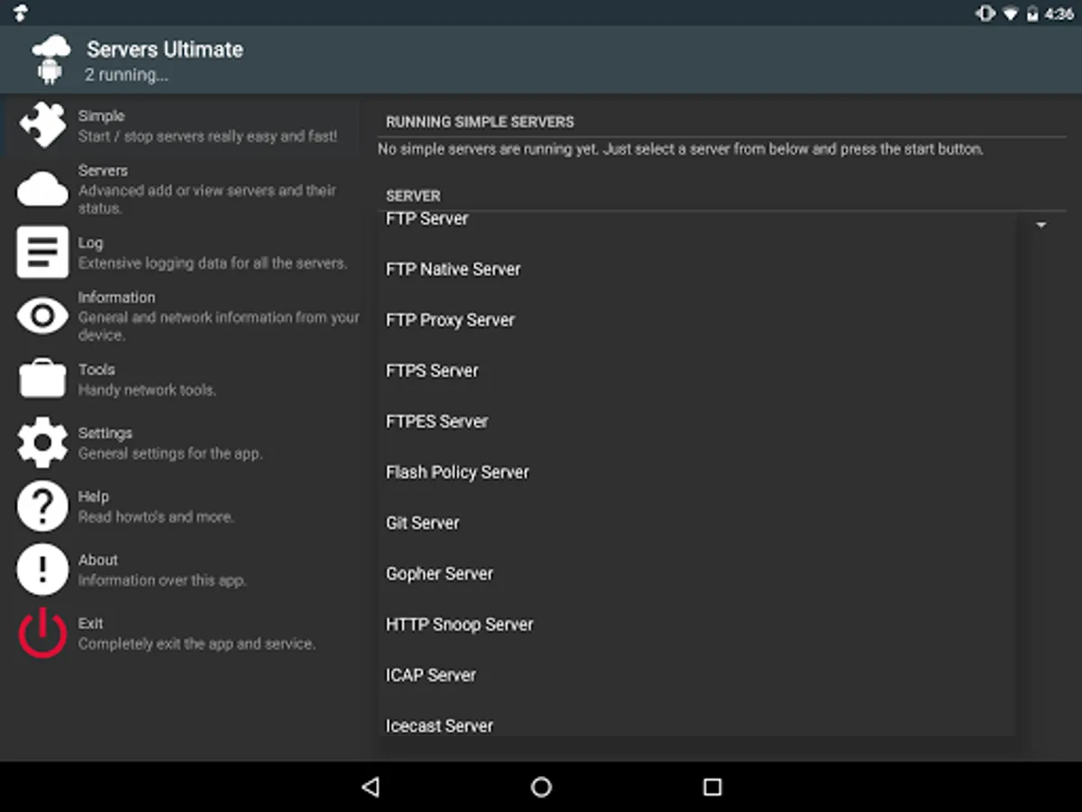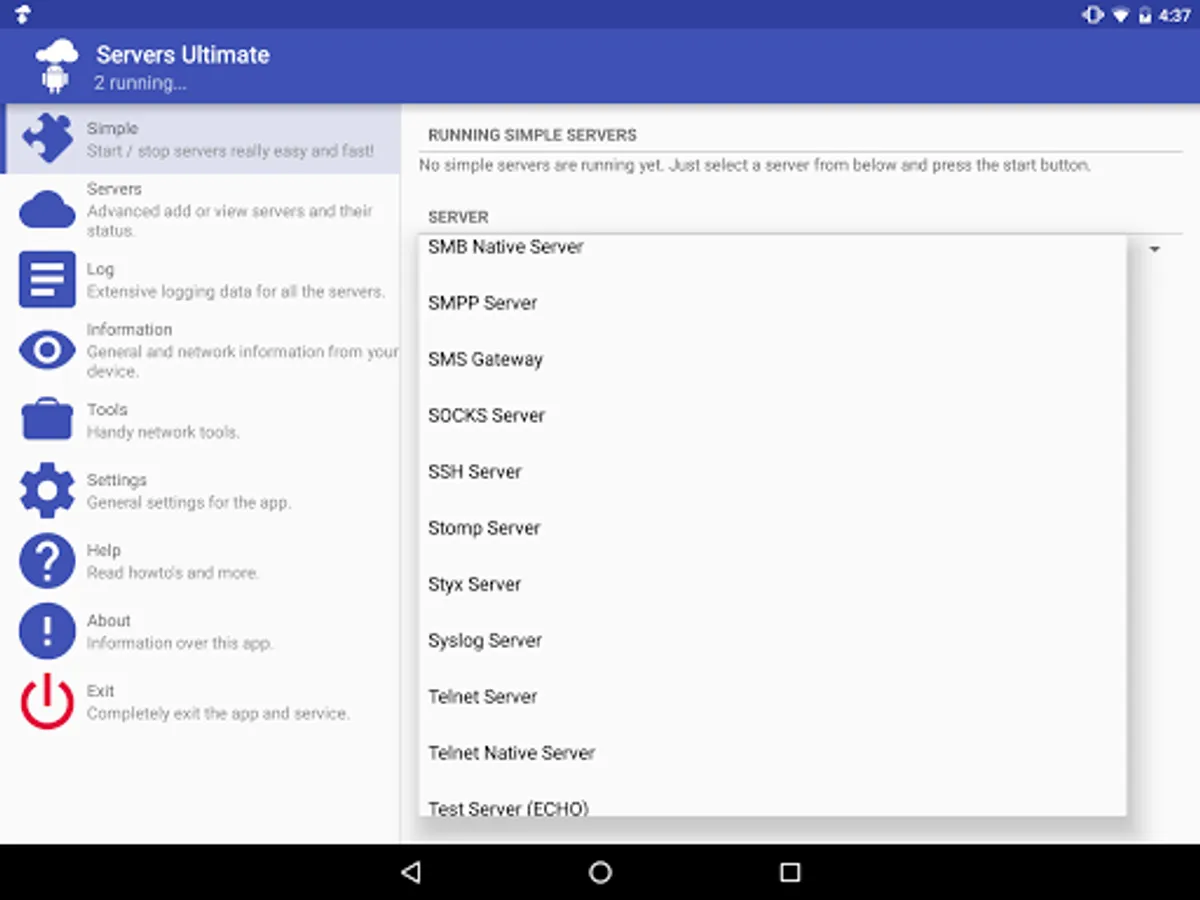 Start a server easily on the 'Simple' tab or go advanced and add users, allowed IP's and more! Multiple servers can be run at the same time! No root needed (exceptions below).