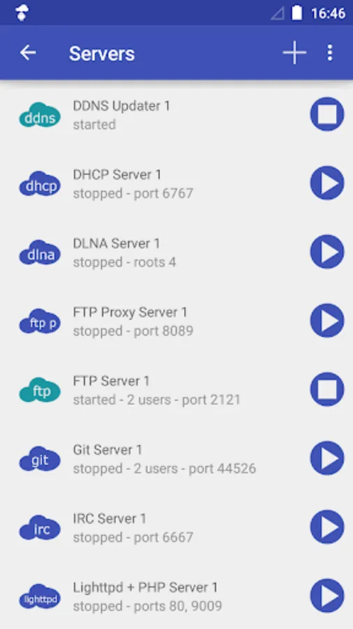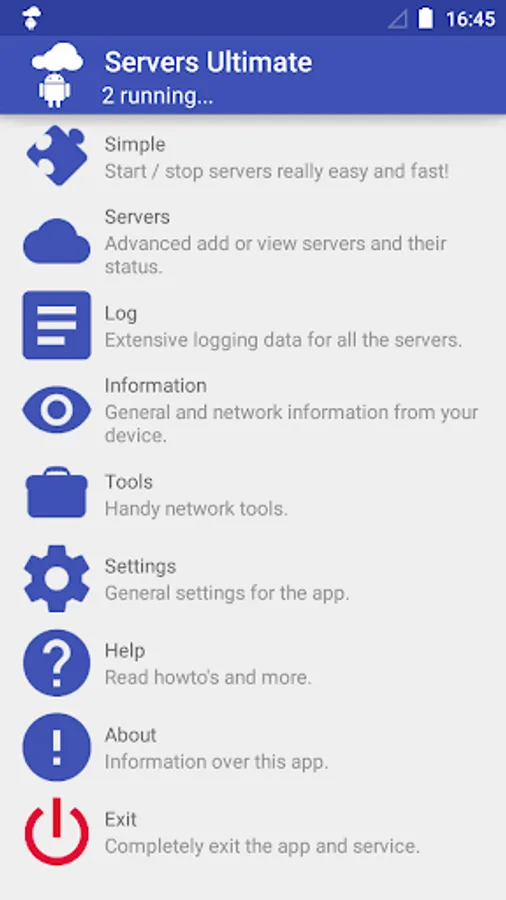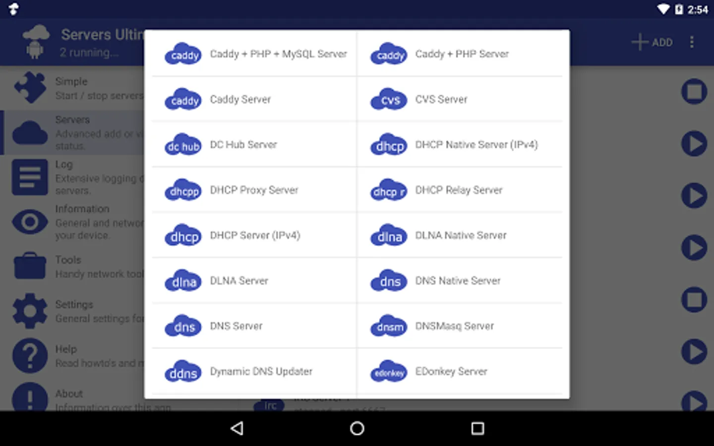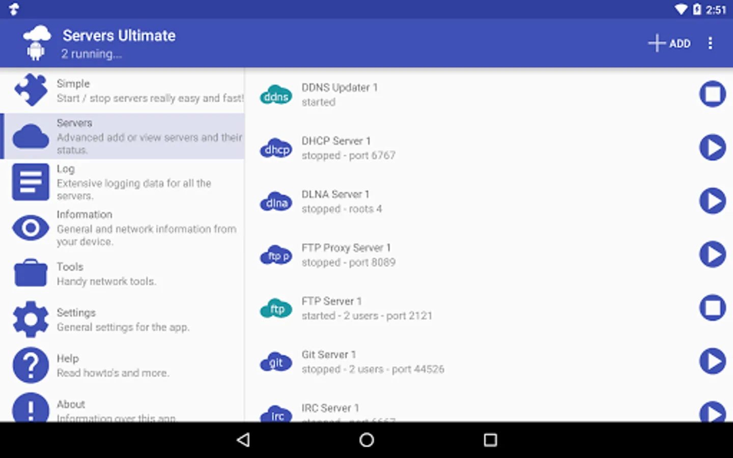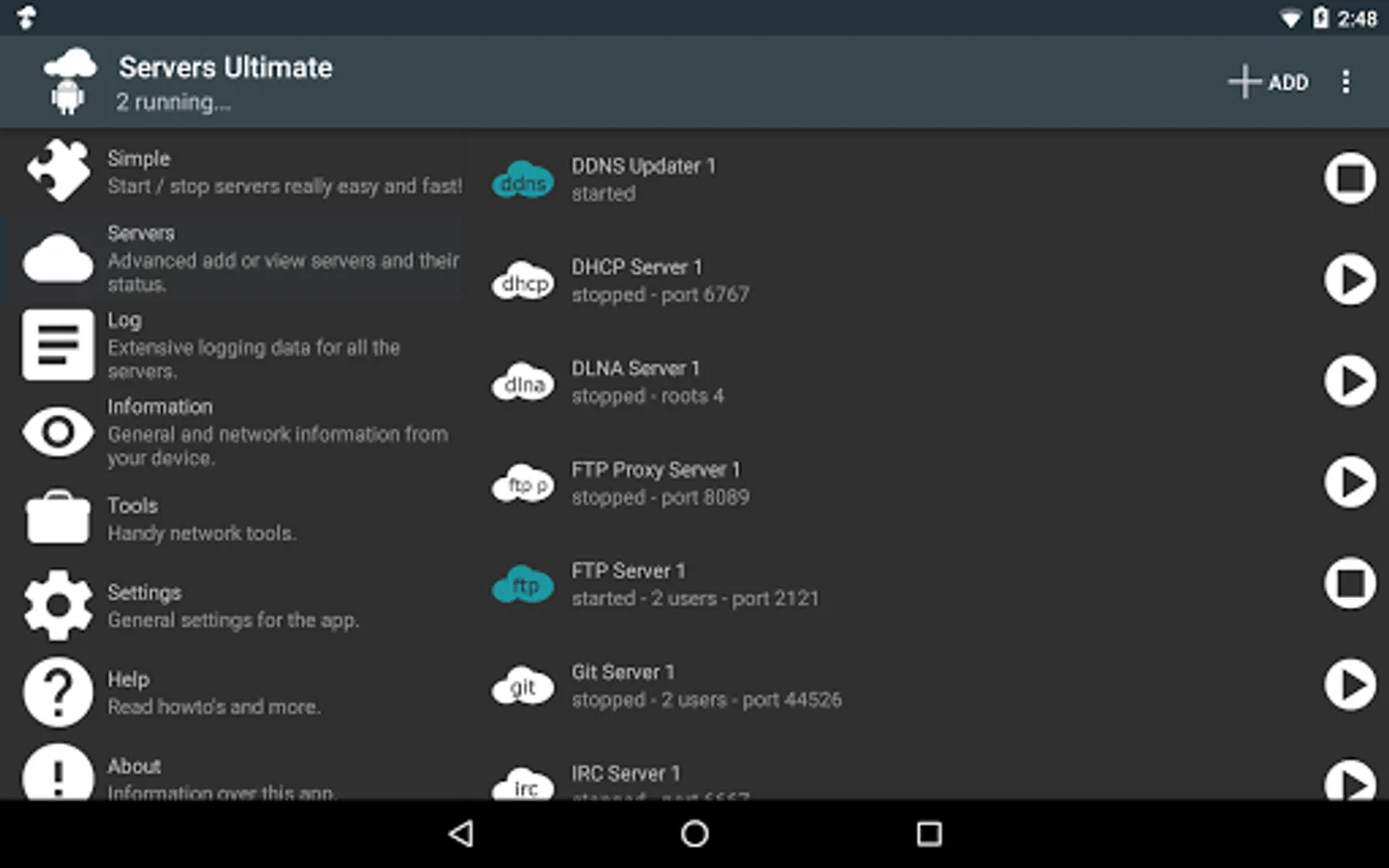Start a server easily on the 'Simple' tab or go advanced and add users, allowed IP's and more! Multiple servers can be run at the same time! No root needed (exceptions below).