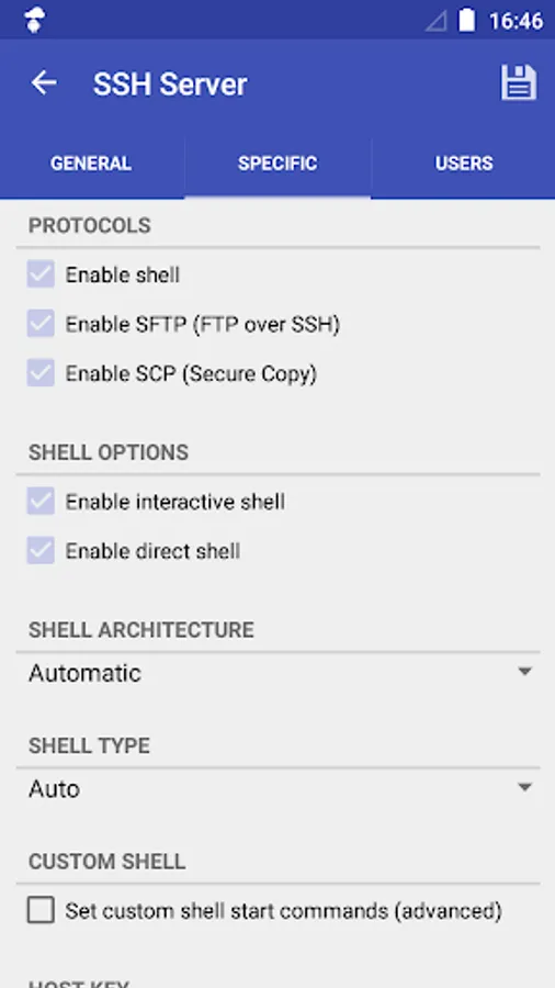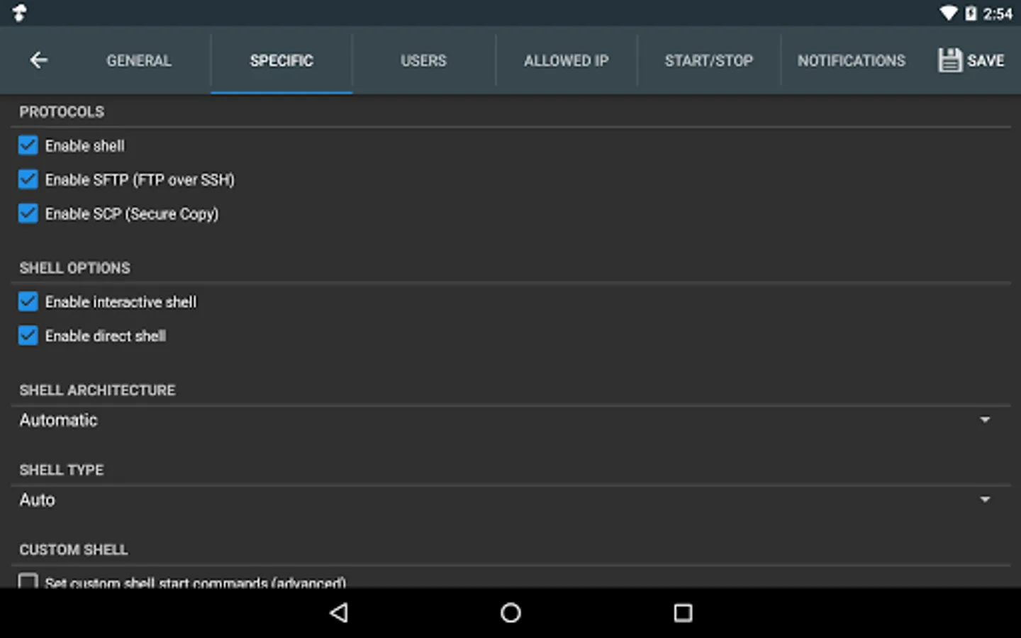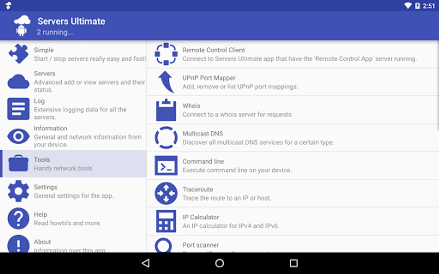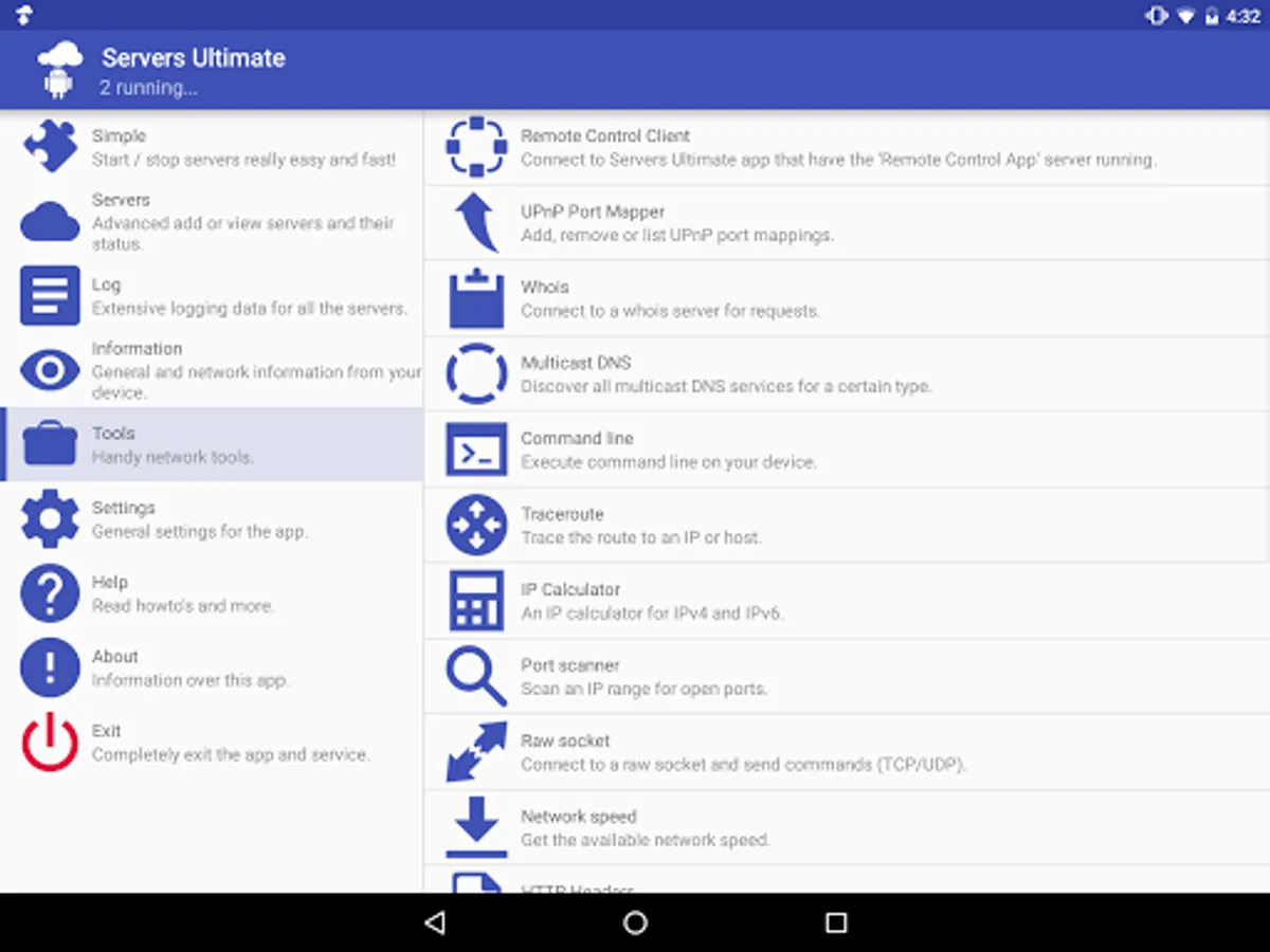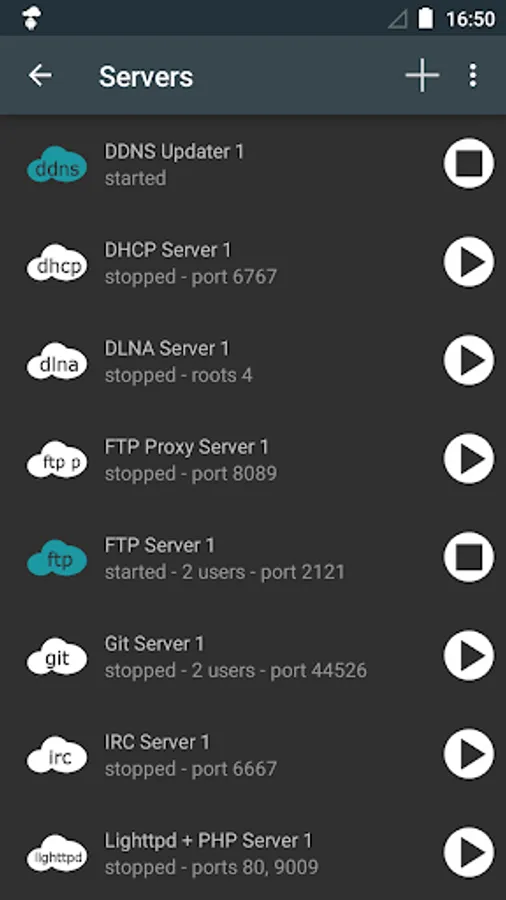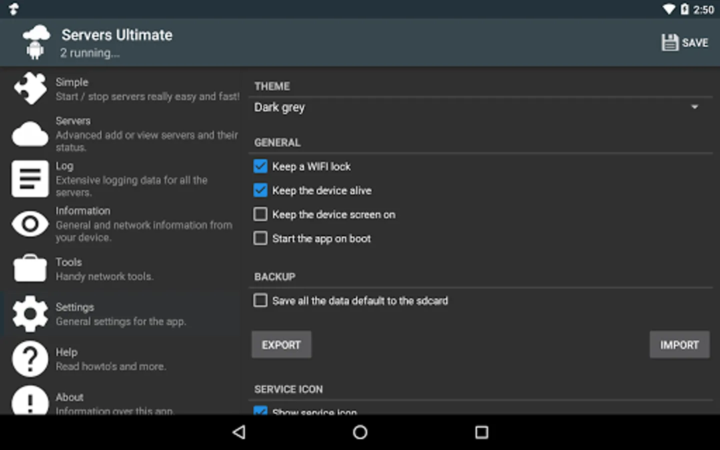 Start a server easily on the 'Simple' tab or go advanced and add users, allowed IP's and more! Multiple servers can be run at the same time! No root needed (exceptions below).