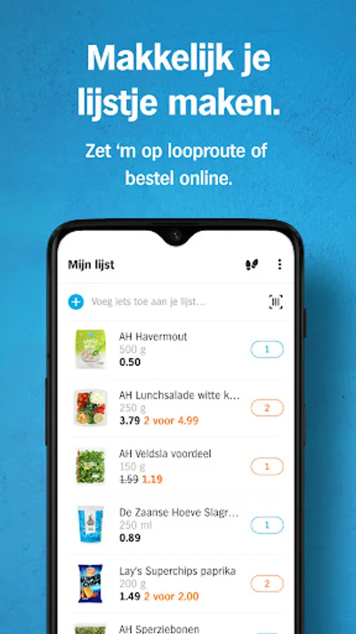 Find your products with the product finder or barcode scanner. Choose from your (personal) Bonus offers or previous purchases. Or add the ingredients from All kinds of recipes to your shopping list. Then put it on the walking route of your store or order online.