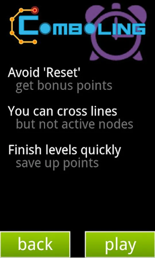 The objective of the game is to connect all highlighted nodes. Moves allowed are vertical, horizontal and diagonal. Don't let the simplicity fool you, the levels are challenging for all. Starting on stage 3, purple nodes are used and require 2 visits to be solved.
