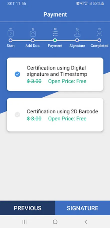 2. Payment after selecting anti-forgery technology (2D bar code, digital signature, timestamp / 2D bar code only)