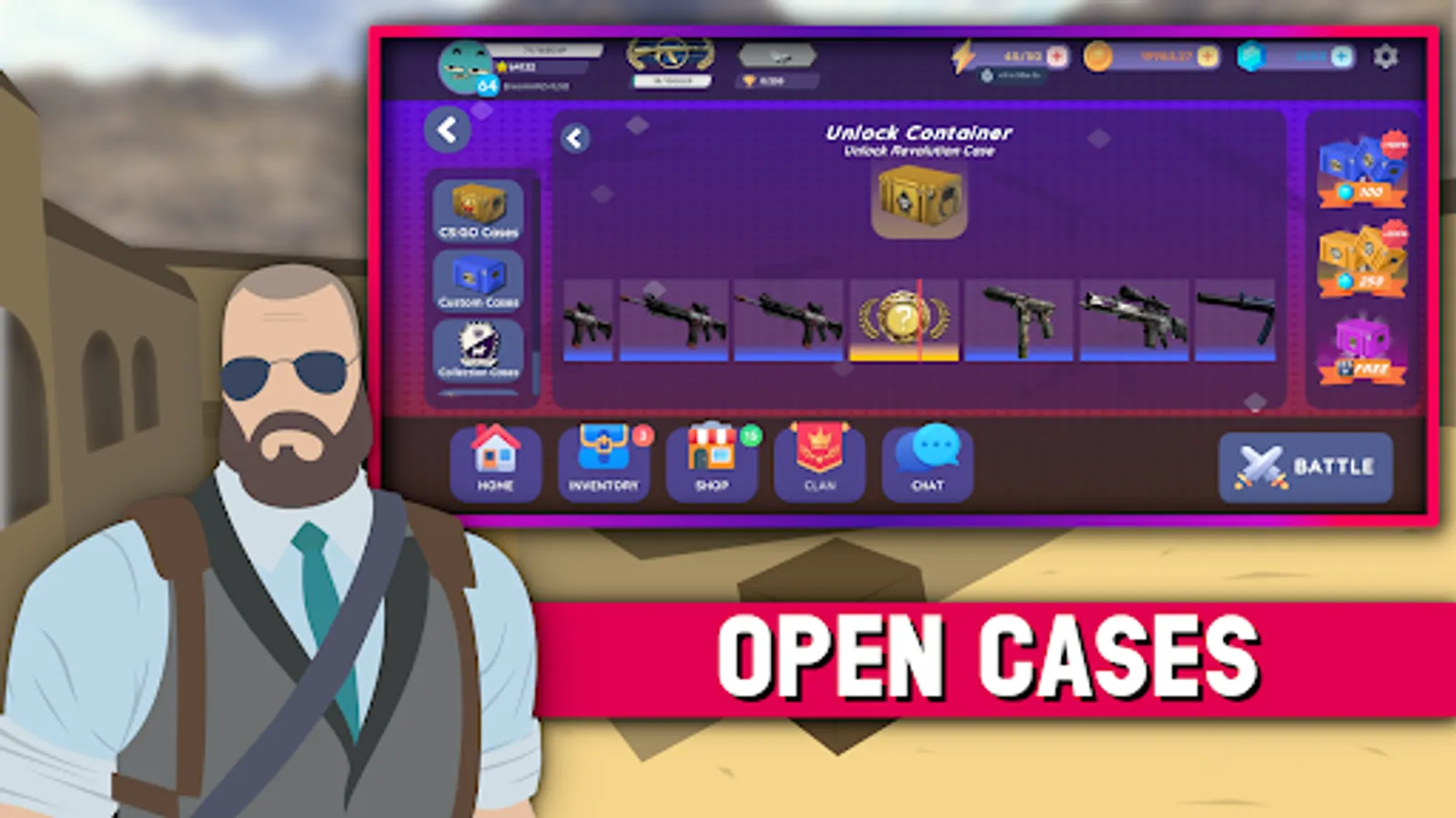 Case Masters - Case Clicker is typical skin inventory builder. Play a simple case clicker and earn coins. The main game feature is to open cases and collect items from a range of different weapons and knives with skins. The game features a wide variety of cases, skins, options to make case battle , coinflip , upgrading your items, fighting with other players and more!