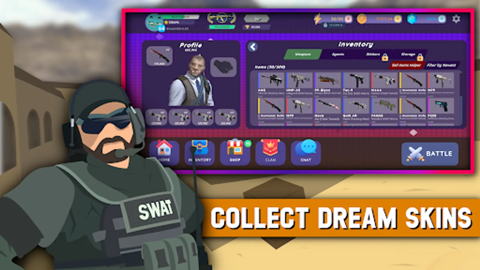 • Equip your character with your favourite cs go skins