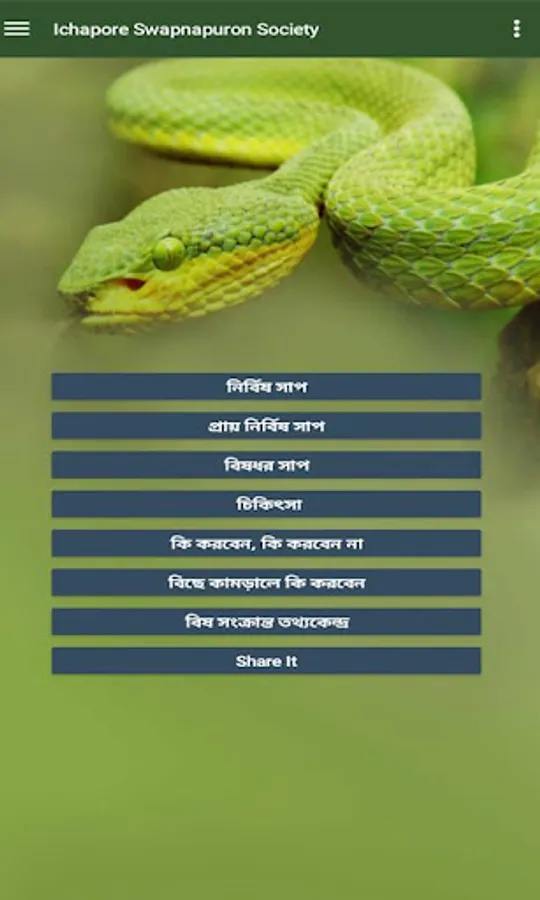 প্রতিবছরে বর্ষাকালে গ্রামে অনেকে সাপের কামড়ে মারা যান। শুধু ভয়ে বেশি ভাগ মানুষ মারা যায় কারন এই সাপ চিনতে না পারার জন্য কারন এই সাপ আমাদের কাছে অজানা আমরা সব সাপ চিনি না, কোনটি বিষধর, কোনটি নয় তাই এই সাপ চিনতে বা সাপে কামড়ালে প্রাথমিক চিকিৎসা কিরকম হবে বা কোথায় যাবো বা কোথায় গেলে সমস্থ তথ্য পাবো, ফোন নং সব পেয়ে যাবেন আমাদের এই এপে।
