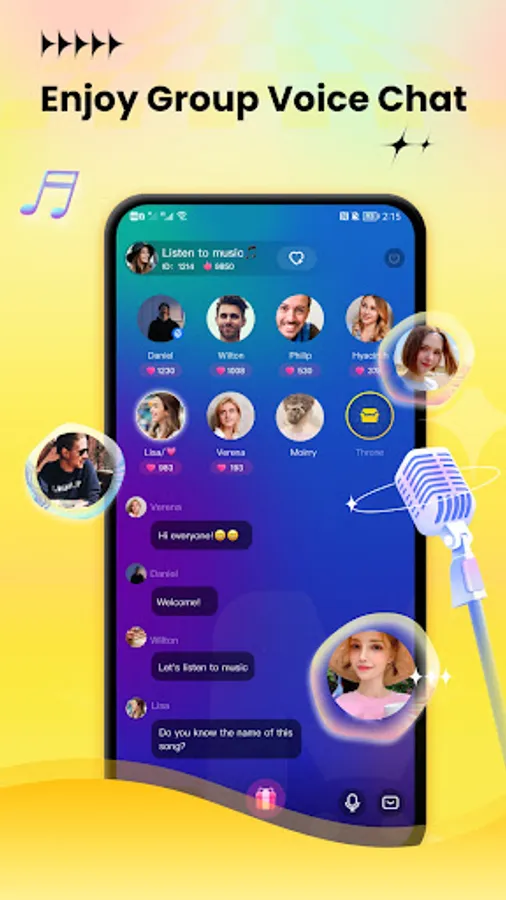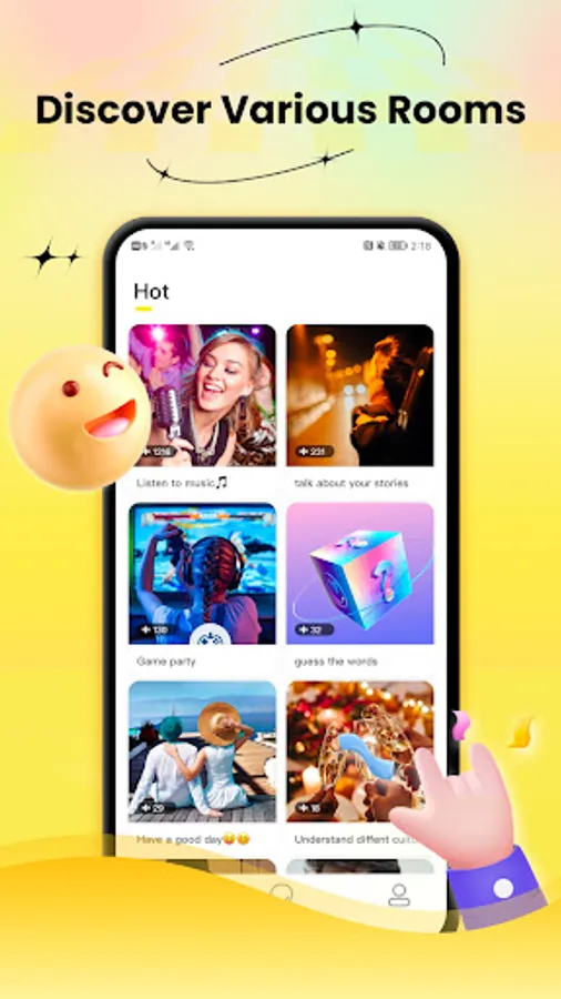 You can discover various voice chat rooms of different topics, find the rooms you are interested in and have a voice chat party with up to 9 friends.