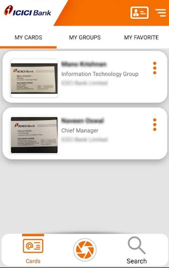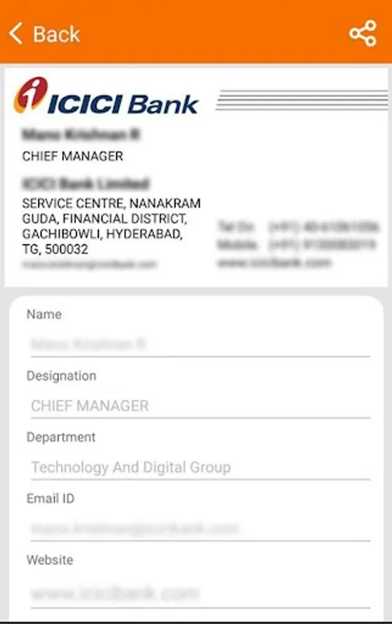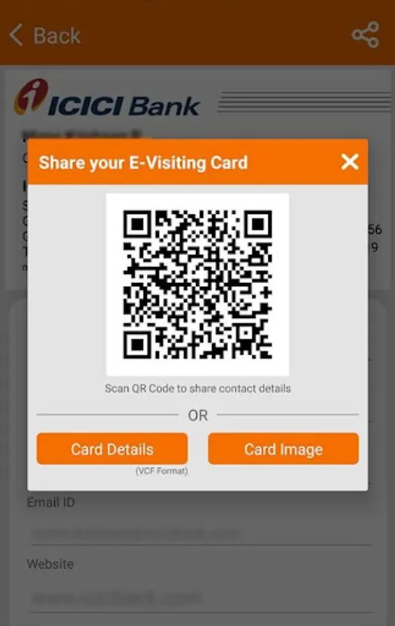 E-visiting card also can be generated for the ICICI BANK employees and can be shared to other people as Visiting card image or VCF contact file.