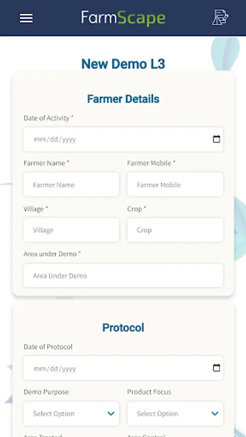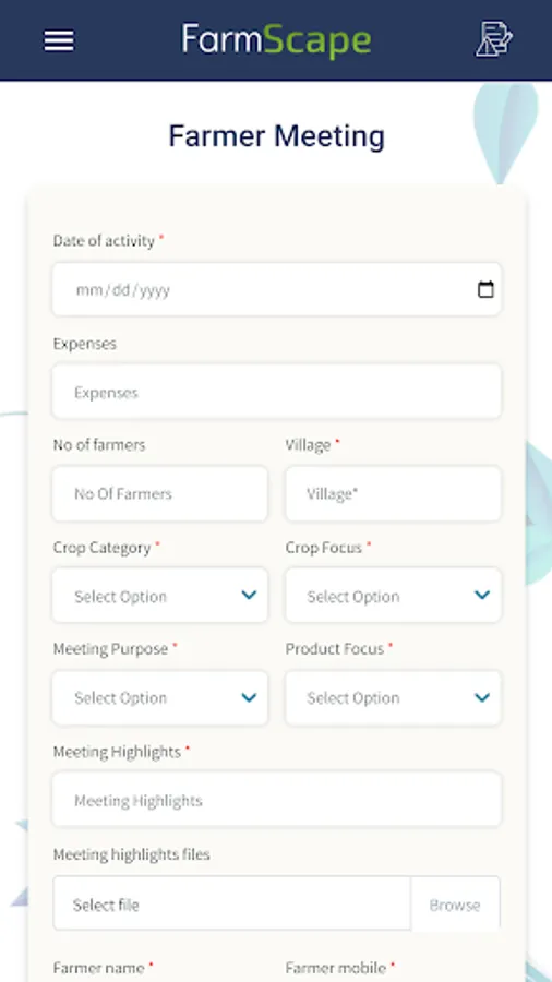 Field Agronomists report their activities to their supervisors and managers using FarmScape. There are various activity forms, files can be attached