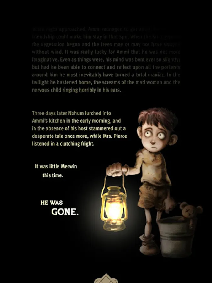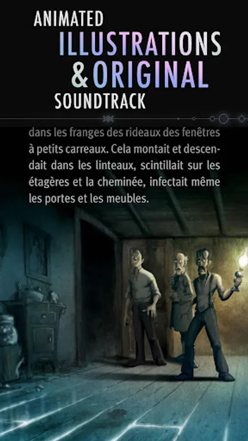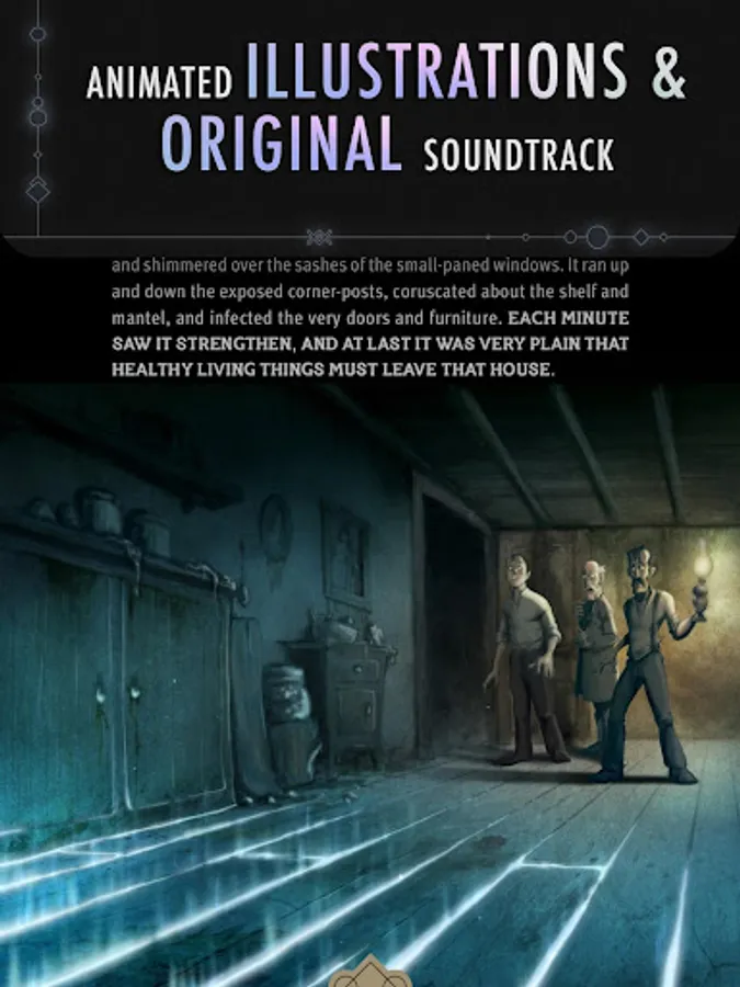 Read, listen, play and move your device, to dive into the story like you've never done before. Going much further than reading a text with illustrations; the experience has animated and interactive scenes, coupled with sound effects, careful design and an original soundtrack, all joined together to immerse yourself in the bowels of one of the H.P. Lovecraft’s most acclaimed stories in an unprecedented way.
