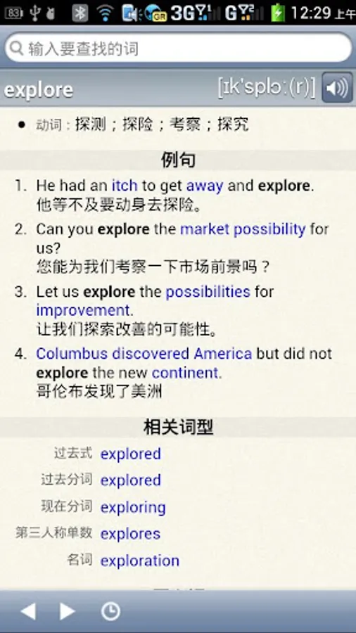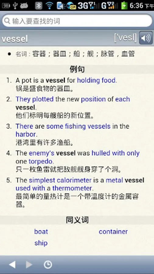 * 相关词、同义词、反义词,以及例句中大多数的词已经链接,轻按一下就能查找该词。