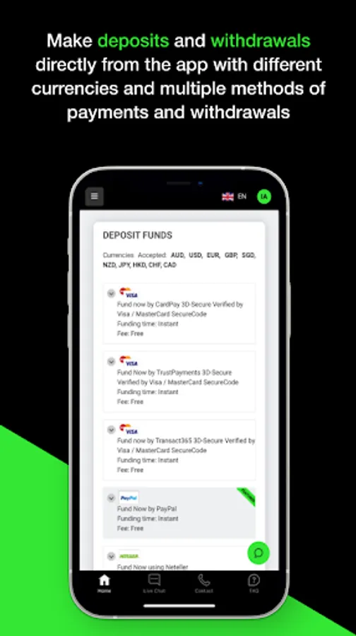 Fund accounts via leading payment methods and transfer funds between accounts.