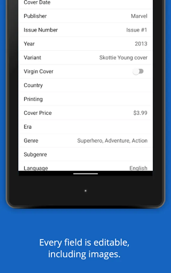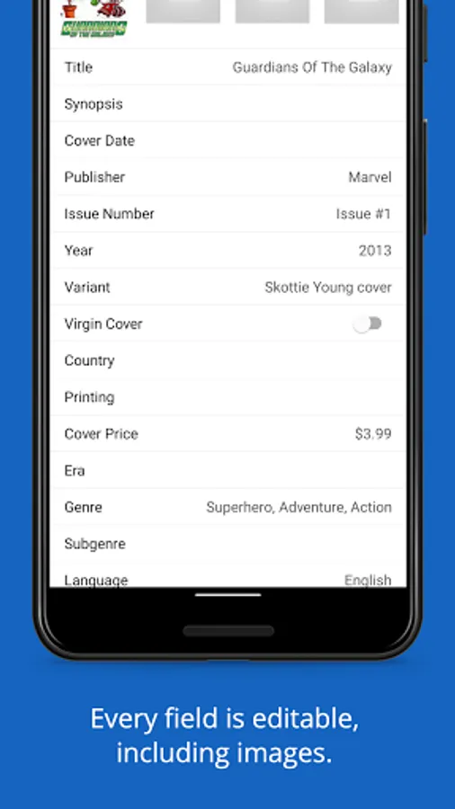 • Store up to four pictures per comic, including front, back, and inside images of comics.