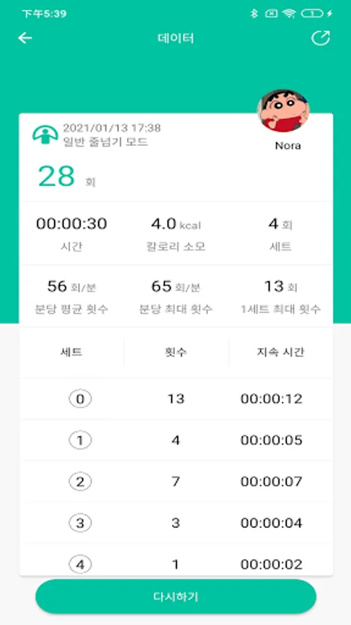 50회~9999회까지 설정이 가능하며 일정 횟수를 진행한 시간과 칼로리 소모량을 기록합닉다.