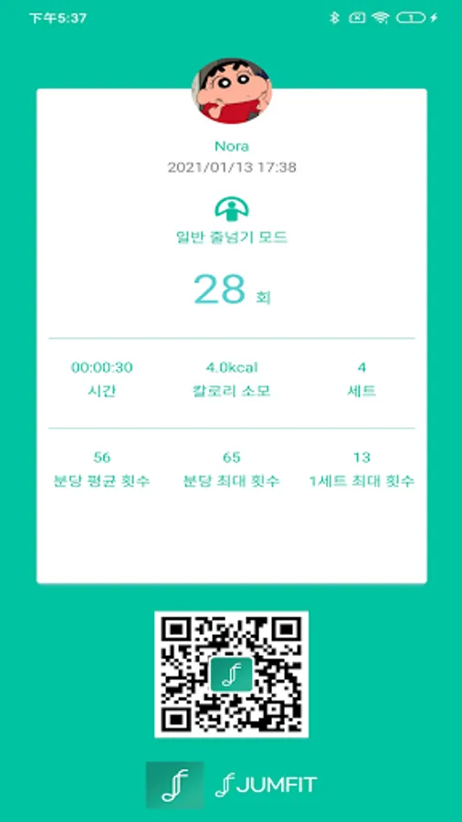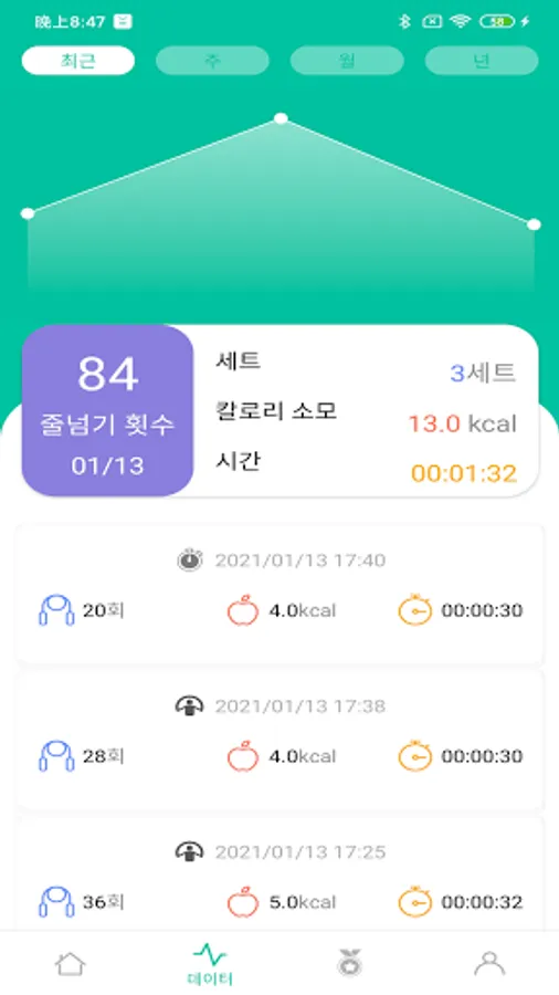 줄넘기 횟수/시간/칼로리 소모량이 기록됩니다.