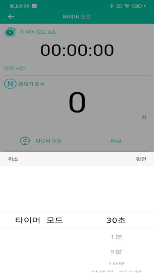 30초~99분59초까지 설정이 가능하며 일정 시간동안 줄넘기 횟수와 칼리로 소모량을 기록다틜록.