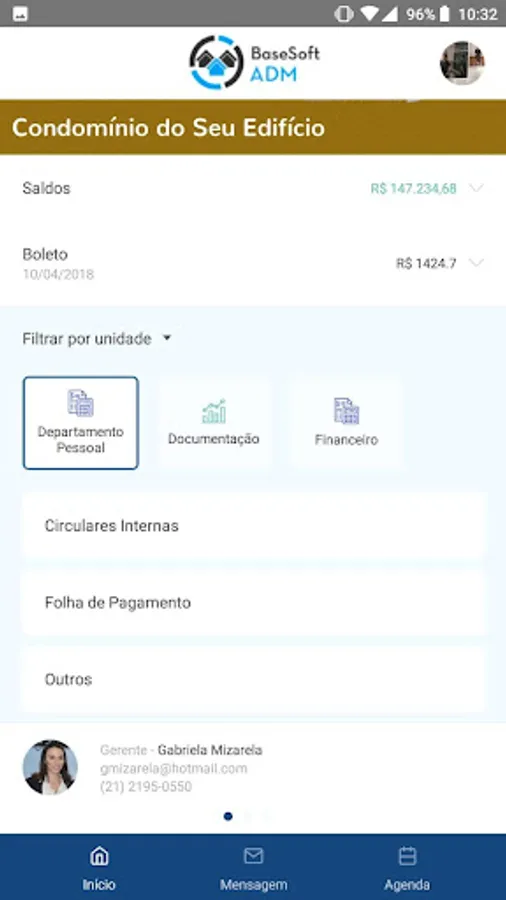 Get immediate access to financial files such as payment slips and financial statements. Also view documents (contracts, survey, etc). Swap messages and warnings, receive notifications in the app, create and track occurrences, with photo.