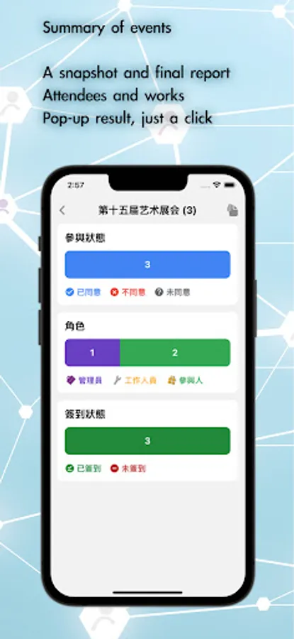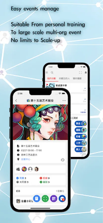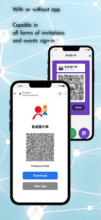 - Diversified participation options: accept or decline invitations, e-tickets, and various check-in methods, any format with or without the app installed;