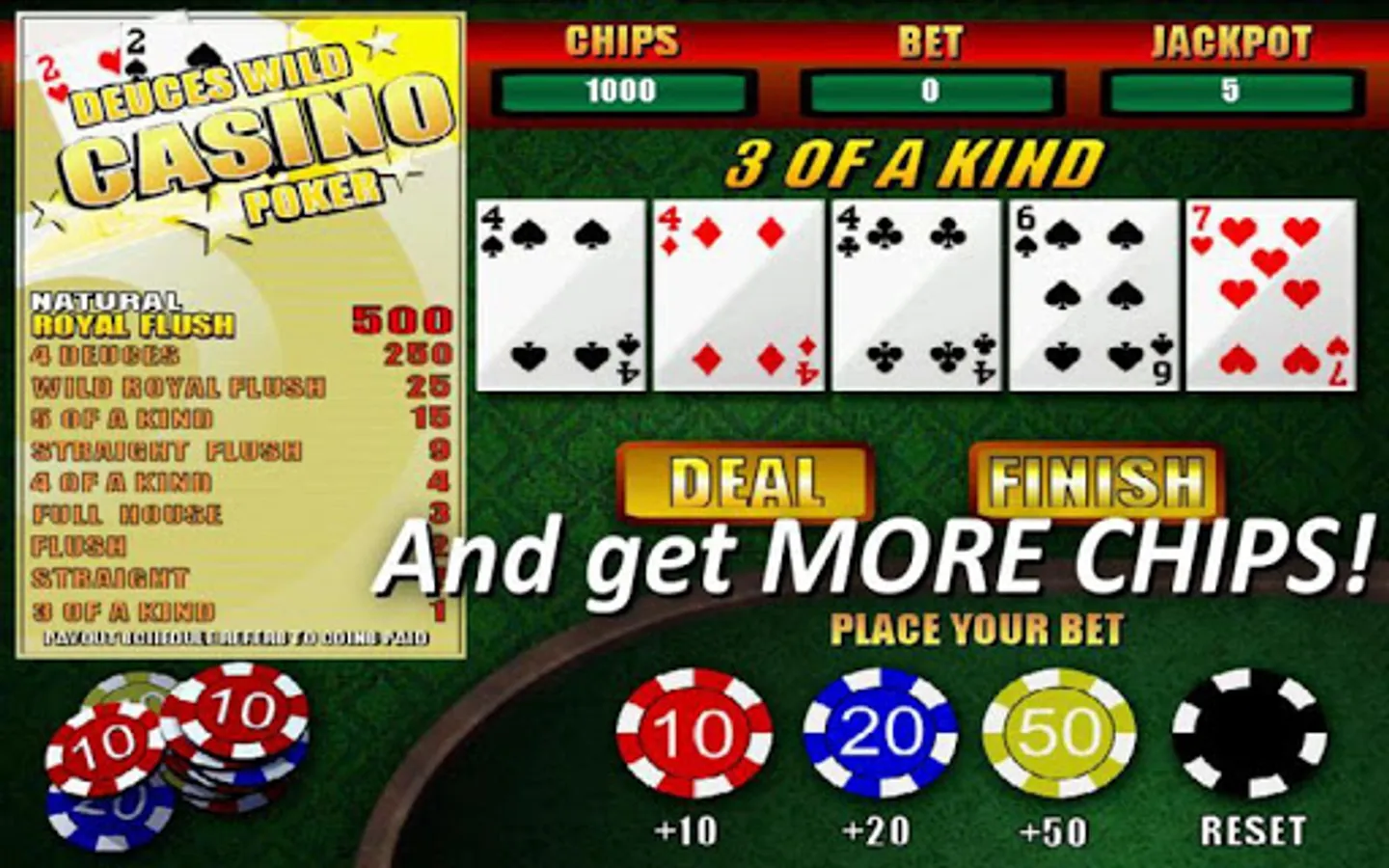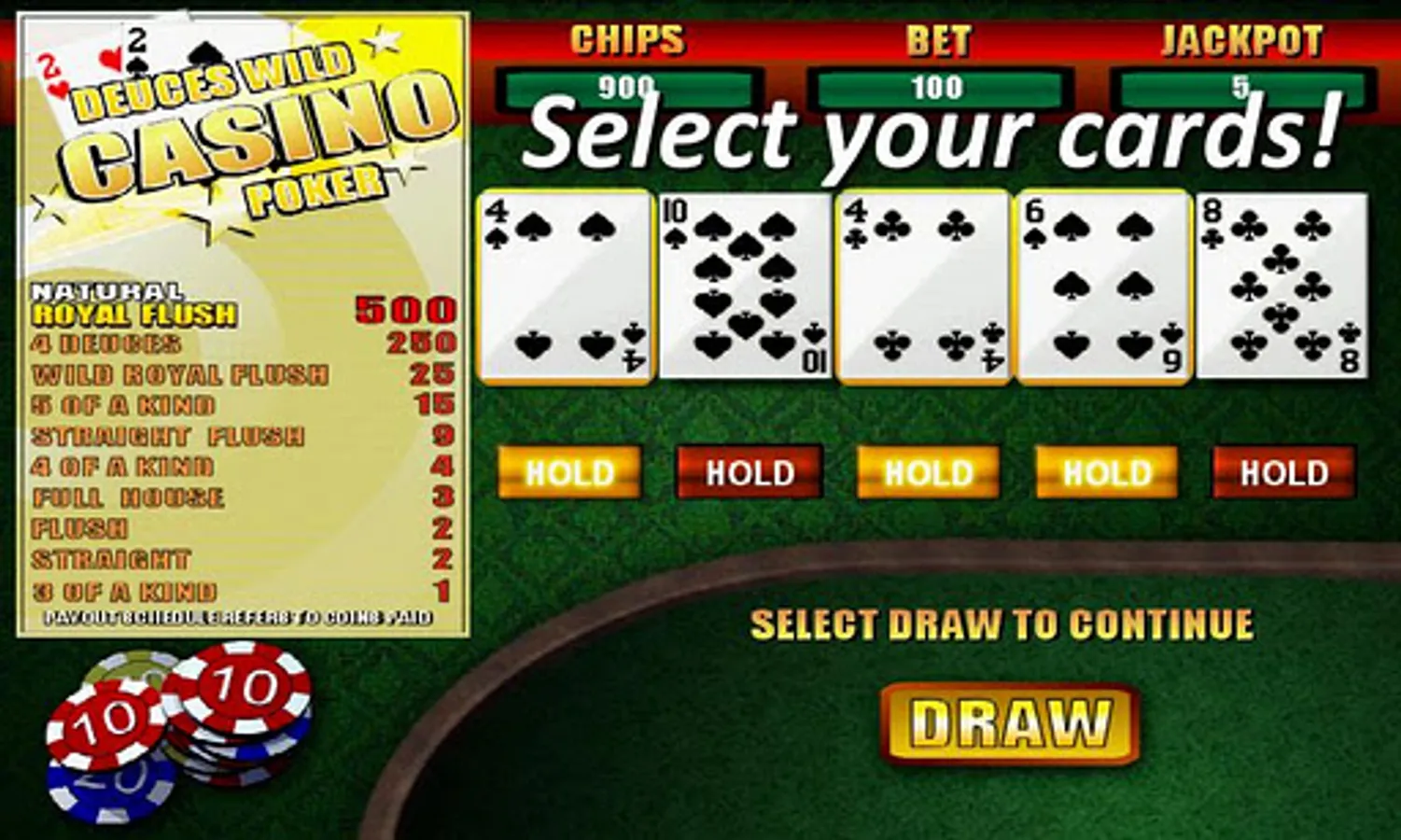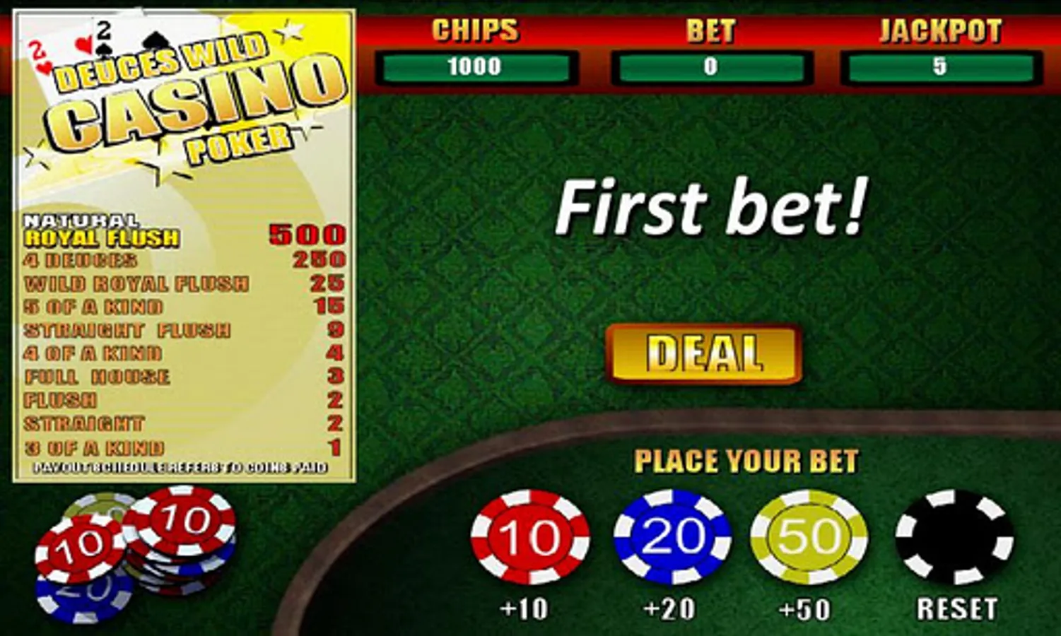 Deuces Wild captures all the fun of the thrilling card game right in your computer! This poker challenge will get you hooked. Play for the jackpot and see if you have what it takes to get a royal flush to win big! Deuces Wild Casino Poker will have card players coming back for more!