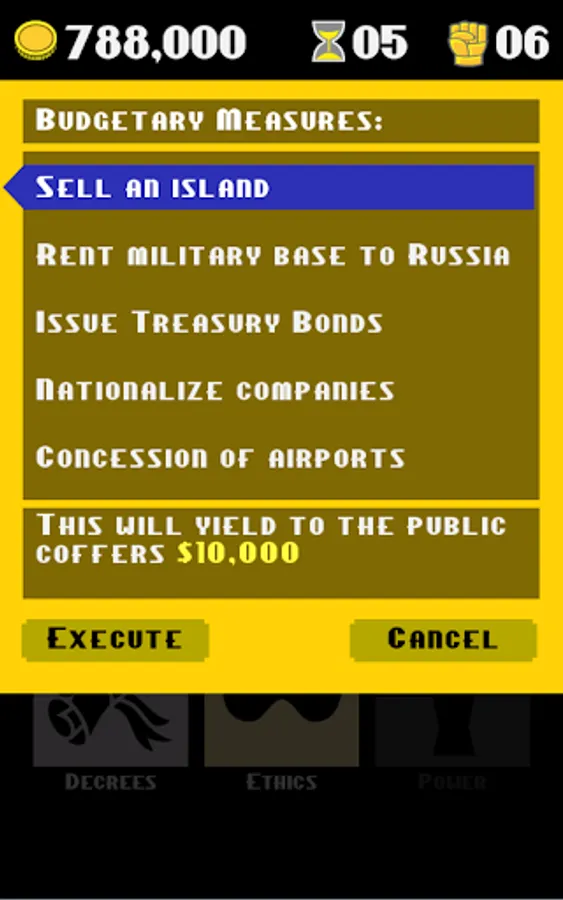 You think the game is too easy? Then try the hard mode, where you start with HALF the money and with low approval! Only the strong ones will be able, with luck, to beat this mode!