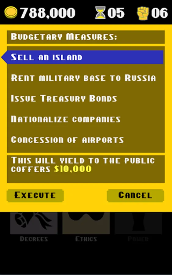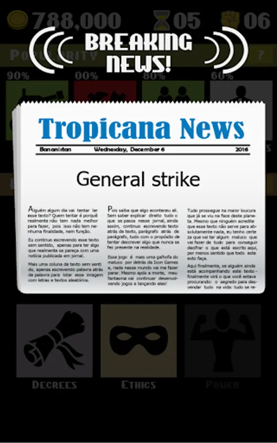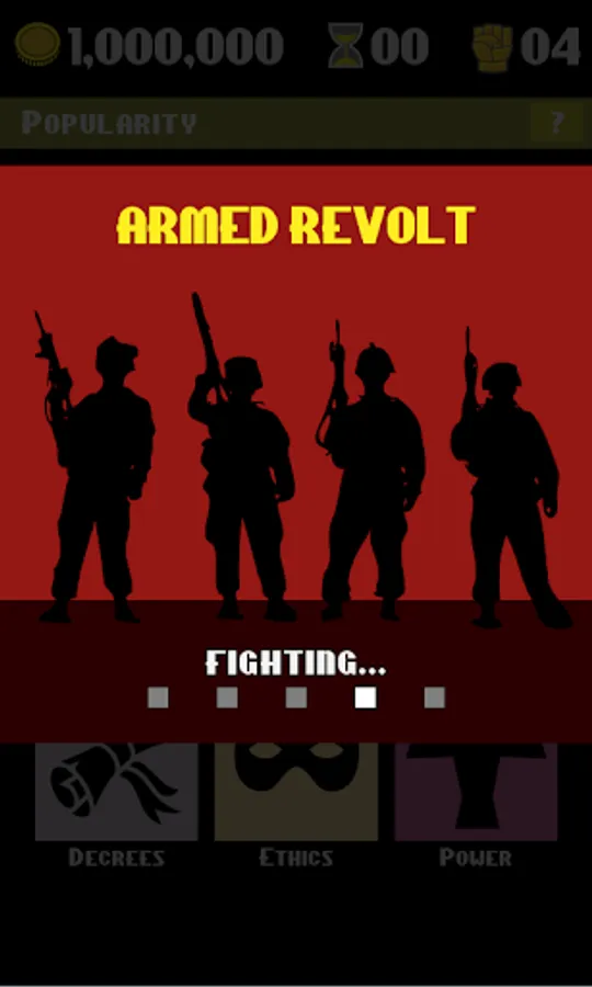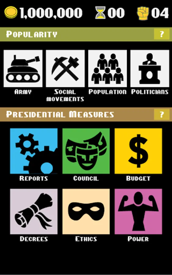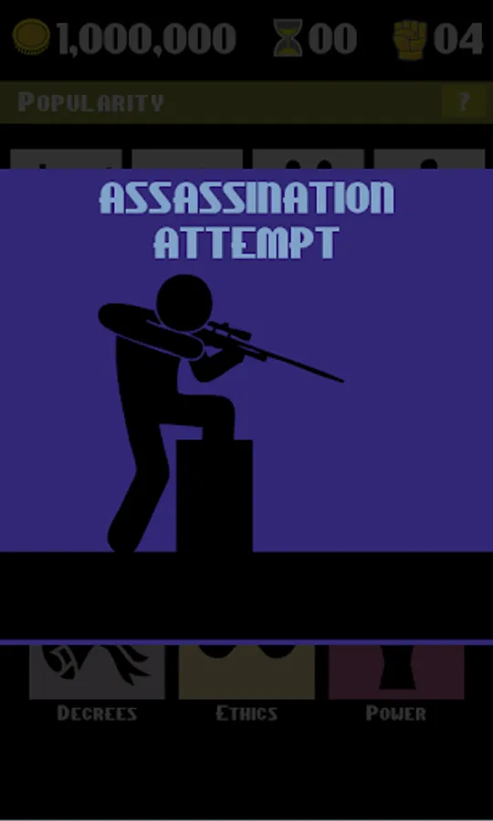 Try to please all sectors and factions of the population - otherwise you run the risk of Impeachment, an armed revolt, or worse, an assassination attempt!