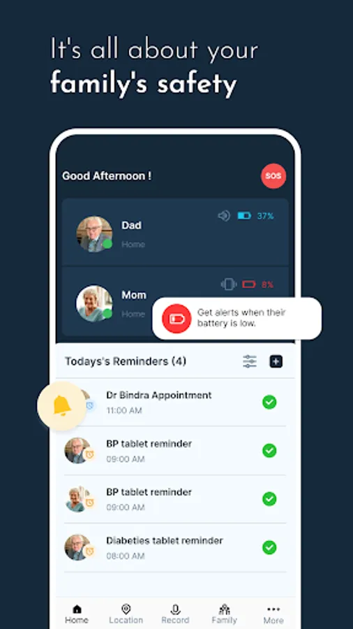At FamConnect it is our mission to ensure your family's safety with comprehensive location tracking and SOS features that keeps you tension free. We offer a peace of mind app that's designed for your needs, from reminders to tracking, to even 24/7 emergency responders.