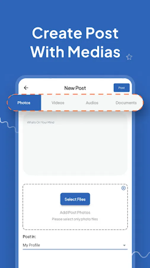 With SocialV - Social Network Flutter App with BuddyPress Backend, you can easily create posts that include multiple types of media. Whether you want to post a photo, a video, or documentation, this app makes it easy to do everything all in one place.