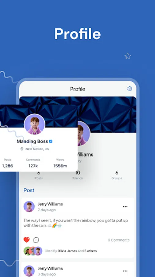 Also Dynamic Profile option With SocialV, you can create dynamic profiles that show off your personal info, social accounts, and hobbies. It's the perfect way to express yourself online and make new connections.
