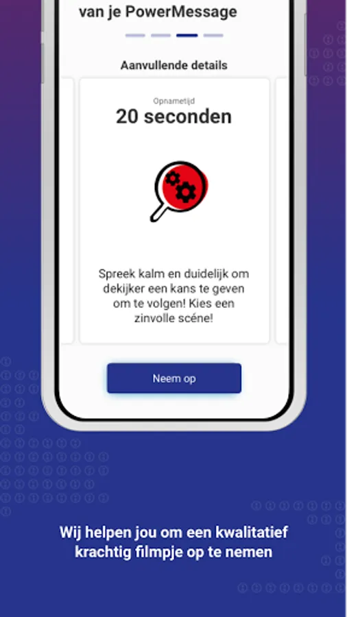 Welkom bij PowerMessage, een nagelnieuwe App die je helpt om kort en bondig in een vlog je verhaal te vertellen. Zó nieuw dat we in de laatste testfase zitten. Dus niet delen, alleen gebruiken. Jij behoort tot de kleine groep die er als eerste mee aan de slag kan. Veel plezier. Het ontwikkelteam van Verbinden in Beeld.