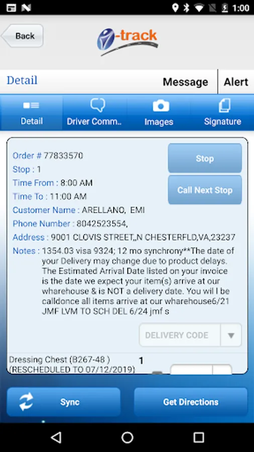 Features include real time updates on delivery, delivery errors, location tracking via GPS coordinates, delayed in traffic, held up at a location, customer signature on delivery, taking pictures of damaged deliveries or damage to property by driver while delivering.