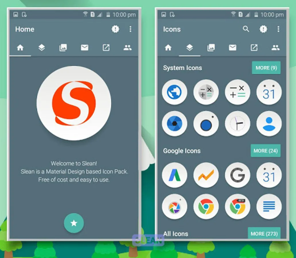 Slean is an icon pack inspired by material design. After opening it, you'll notice beautiful, material dashboard, where you can apply it to selected launchers, change wallpapers, or request icons that are missing on your device.
