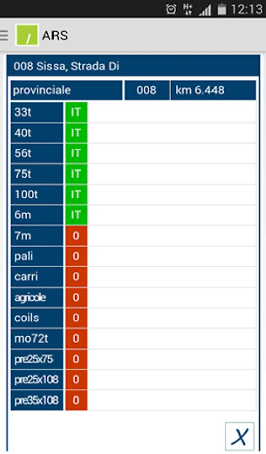 Each odonimo also associated with the limits of the 15 types of special cargo (33t, 40t, 56t, 75t, 100t, 6m, 7m, poles, railway wagons, farm, coils, 72t machines, prefabricated 75t x 25m, 25m x 108T and 35m x 108T).