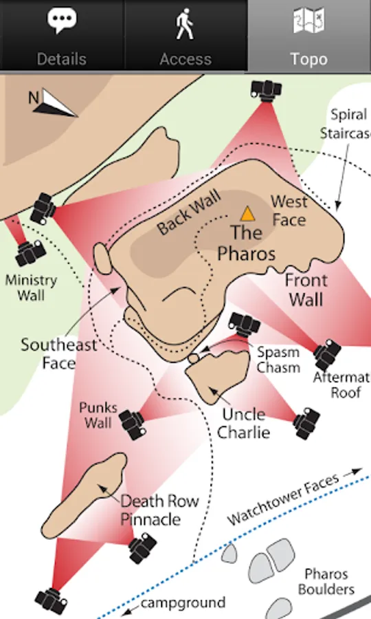 Unlike other climbing guide apps that simply show the information from the hardcopy guide in much the same static format, iCrag leverages Android's interactive capabilities producing a unique user experience. Navigate the guide with hotspot links on the wall images themselves. Zoom images using the pinch or double tap gestures to get a closer look at the next pitch. Touch on a route line to pop up its description. Use the indexes and search function to find routes that fit your needs.