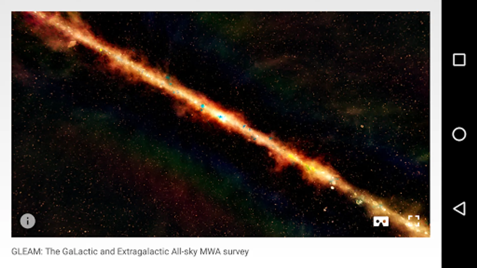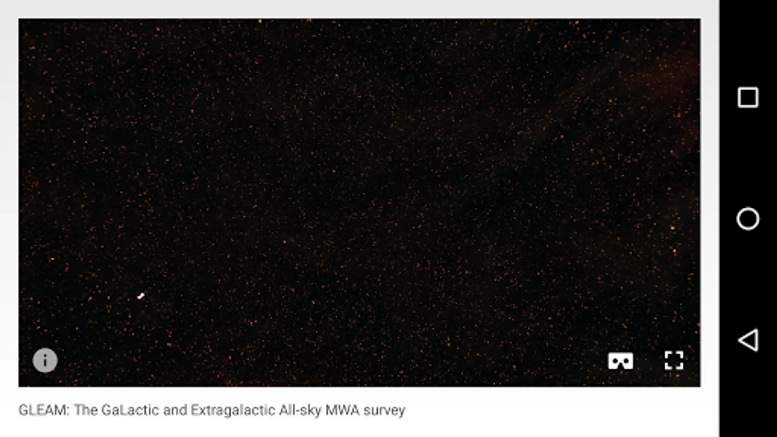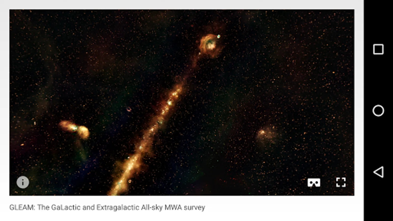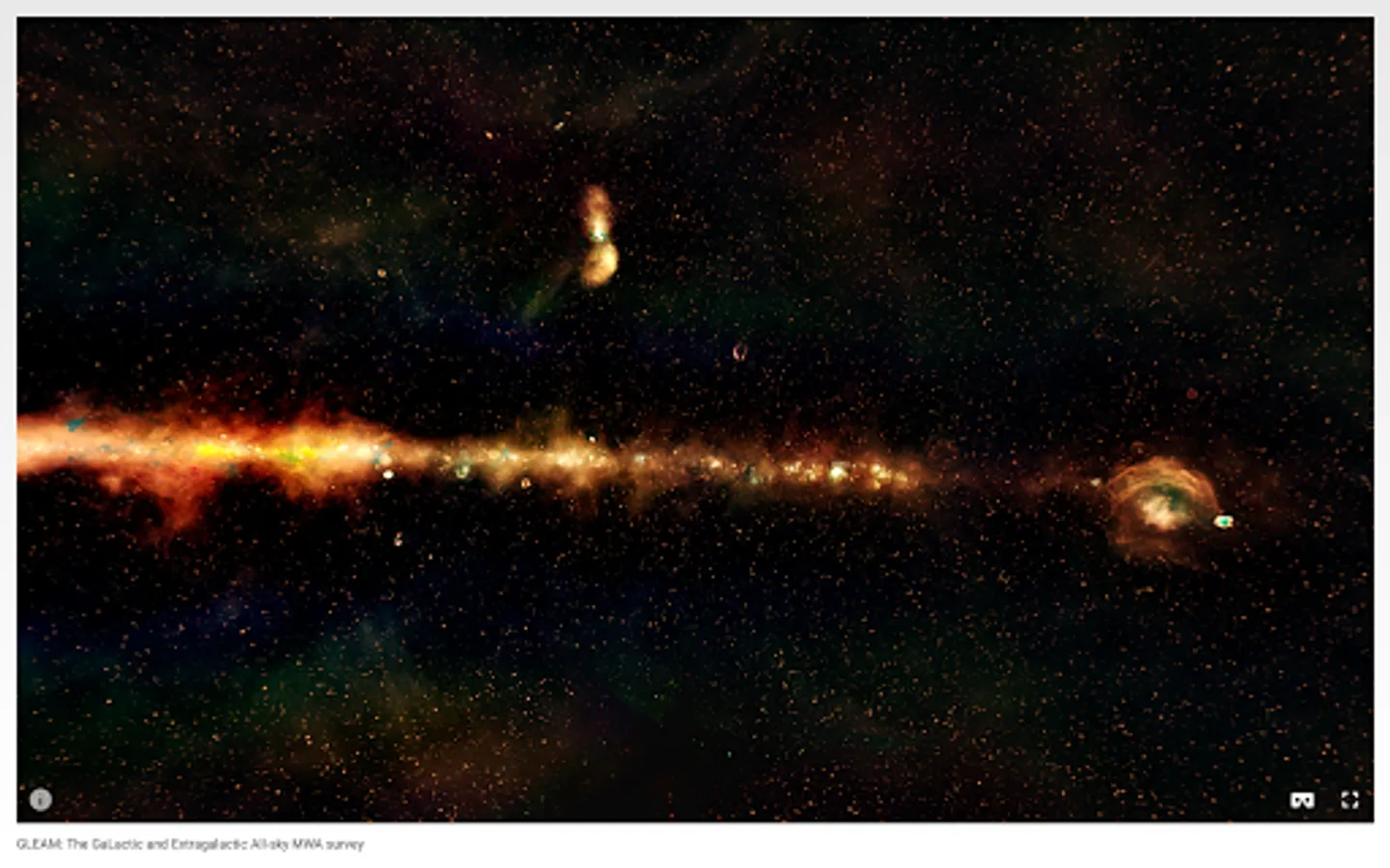 You can also use Google Cardboard to see a 3D view of GLEAM; although note that the 3D is representative, not astronomically accurate -- or you wouldn't be able to see any 3D at all! The Milky Way appears closer, the Magellanic Clouds more distant, and other radio galaxies appear more distant still, and distributed throughout the depth of the universe. You can find out more about the survey at http://gleam.icrar.org, and see the universe in other wavelengths on our interactive viewer, GLEAMoscope, at http://gleamoscope.icrar.org.