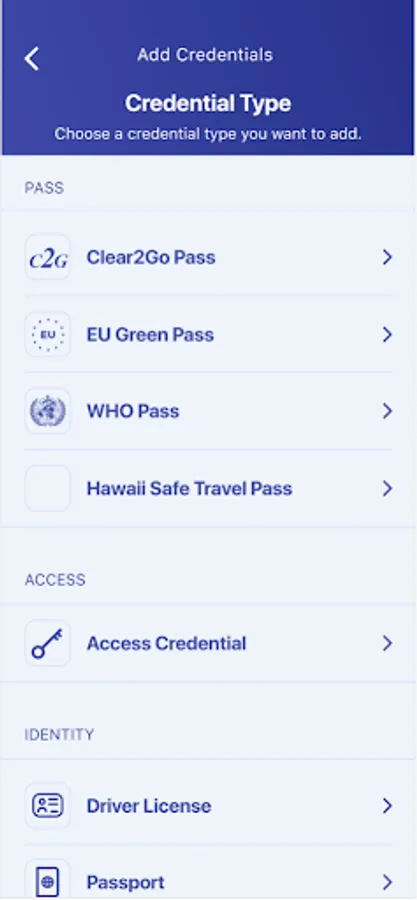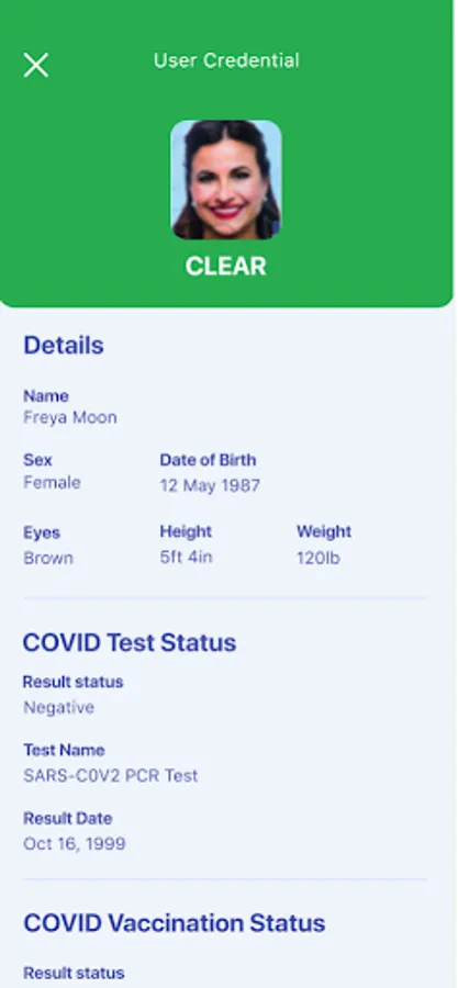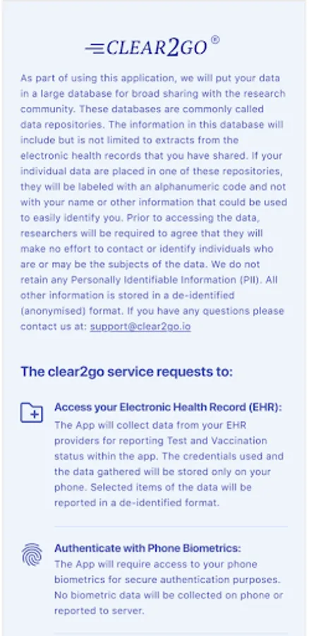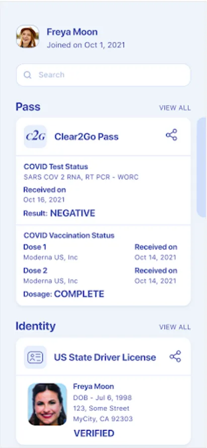 Clear2Go is a distributed identity mobile wallet that enables users to securely store their important information, credentials, and documents on their mobile. These records are securely stored only on the user’s phone thus protecting user’s sensitive data and privacy. This wallet can be used to share via QR code non-refutable proof of testing or vaccination status of an individual. Users directly connect with health systems for their test results which are kept completely private and are stored only on the user's mobile.